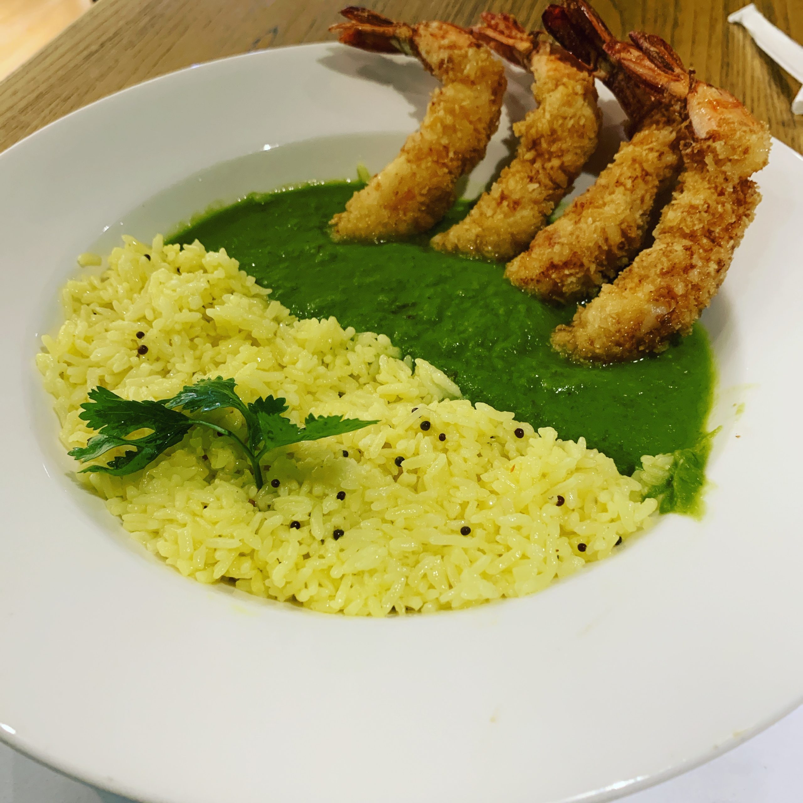 タイのグリーンカレーと思って頼んだらサグカリーだった色鮮やか。トッピングはジャパニーズな感じ