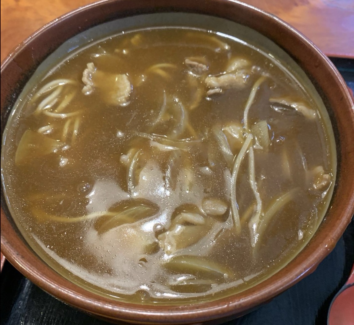 カレーそばはとろみが少なくさっぱりとしている。うどんの場合とろみが強い方が好きですがそばは このくらいの方がいい。全体的にそばの色、豚肉、カレーと全て茶色系なので色味的に違う色があると映えた気が青葱とか入ってると良かった。