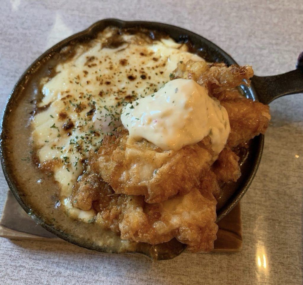 焼きカレー チキン南蛮トッピングです 出てきて唐揚げどっさりボリューミーでしたが完全な冷凍唐揚げレンチンの味で美味しくないタルタルでごまかしてる感じ値段に見合ってない。焼きカレーの方もチーズが多すぎてカレーの味がほとんどしない。オムライスの方は美味しかったので期待してたけど残念でした