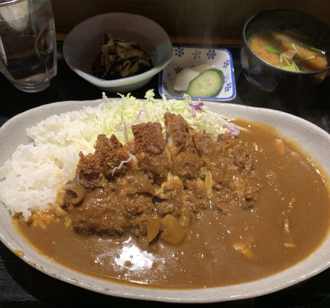 千切りキャベツが乗っているカツカレーで金沢カレーのような見た目。とんかつは柔らかく上げ具合もよくとても美味しかったのですがルーが水っぽくカツカレーに合ってない感じ残念