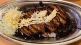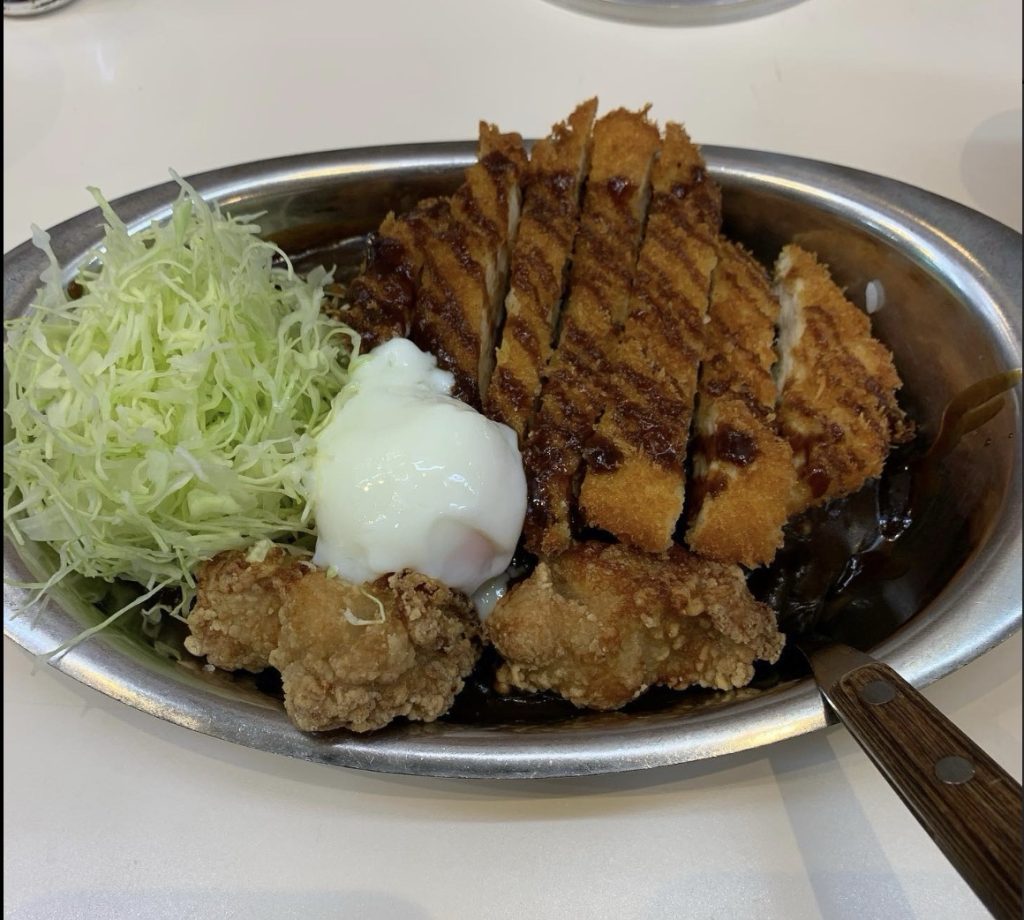 チキンカツ、唐揚げ、温泉卵が乗っているとりプルカレー チキンカツと温泉卵はいいですが唐揚げが冷凍モノっぽくイマイチですね、、まぁルーが主役なんでいいですが
