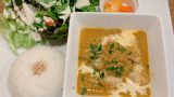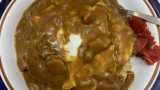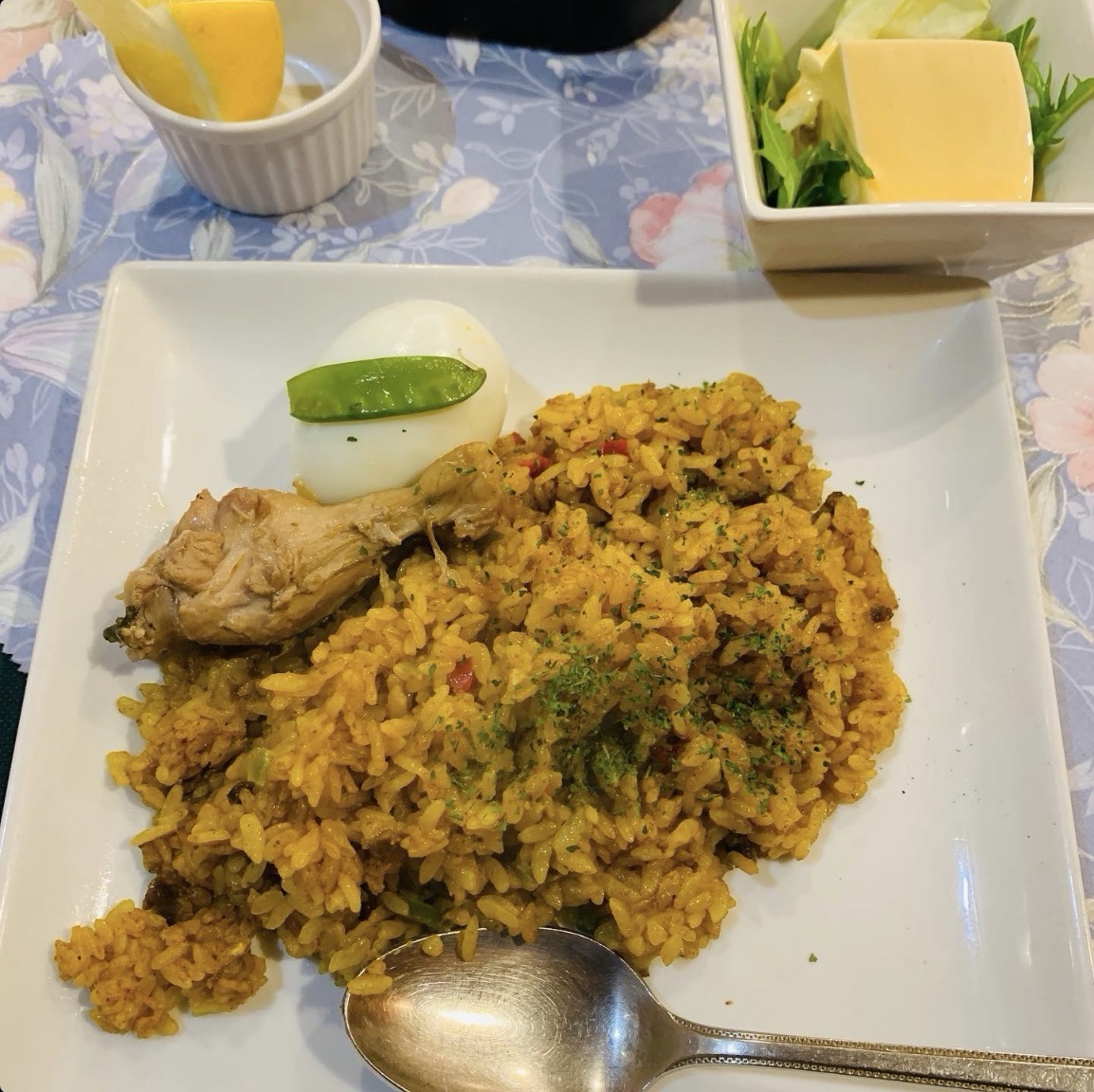 豆腐サラダとドリンクがついていてくる。ドライカレーといっても昔よくあったカレー粉をご飯に混ぜて炒めたカレーチャーハンです。茹で卵とチキンで昔懐かしセットの出来上がりという感じ。