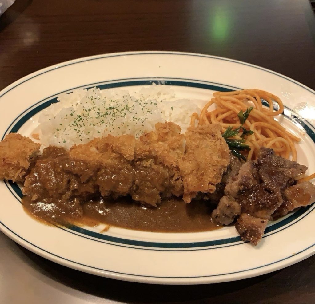 ローズプレートはチキンカツ、スパゲティ、ステーキが乗っていてトルコライス風。チキンカツはサクサクで、ステーキ肉は柔らかで一皿