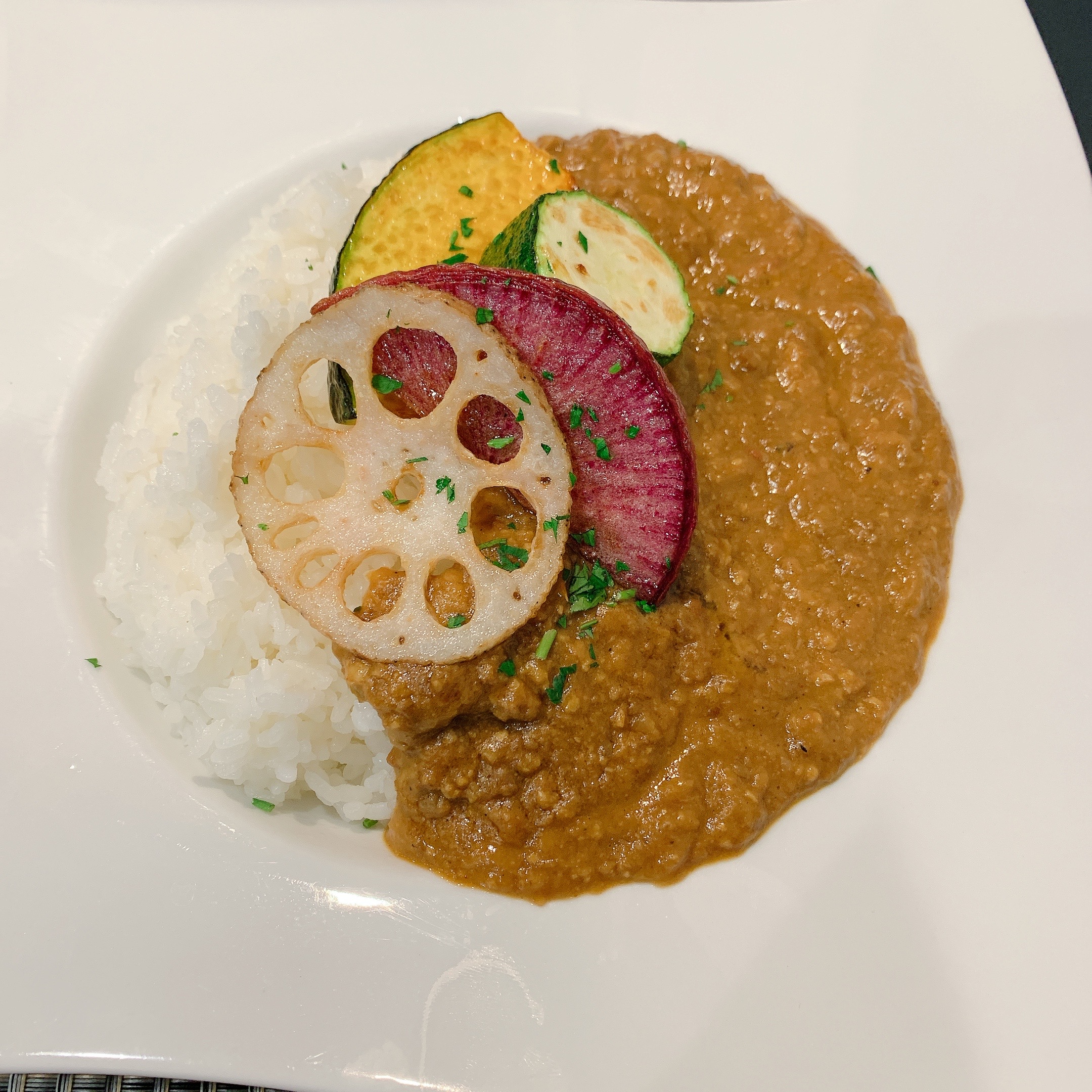 キーマカレーの上に焼き野菜たっぷり、ルーがたっぷりなのがうれしい。ルーは濃厚で、味噌?ぽい肉も多く食べ応え充分。カレー専門店より美味しい気がする。