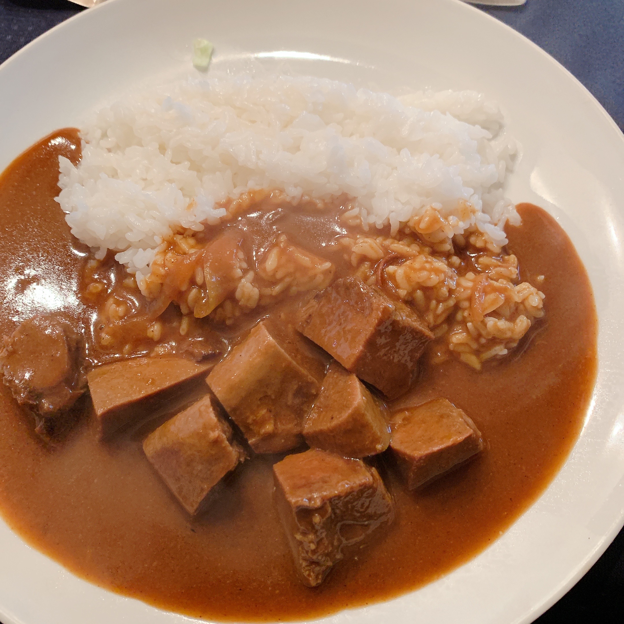 ルーは欧風で少し甘めですがスパイシーさもあり上品な感じの味。牛タンがたっぷり入っておりとても柔らかい いっしょについてきたサラダやデザートも普通の店より一段上