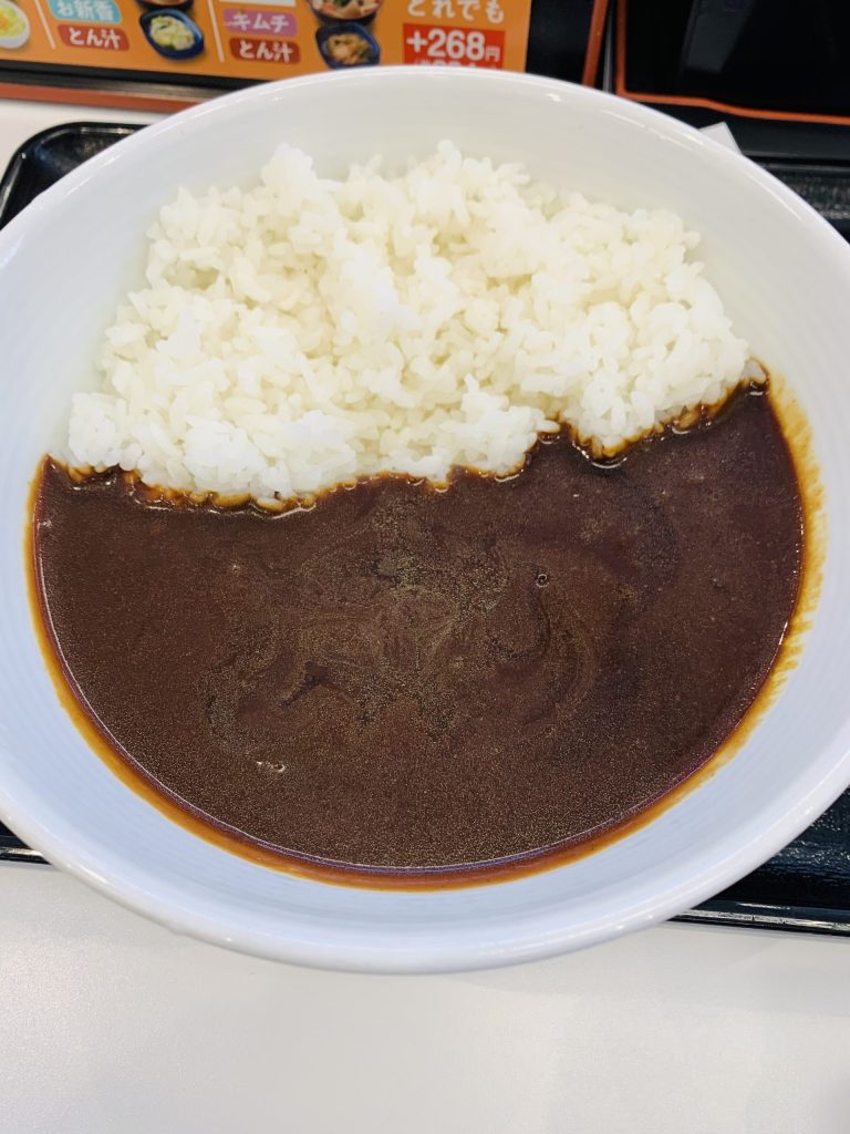 黒カレーという名前だが、全く黒くなくどっちかというと赤っぽい。 最近増えてる気がする甘さと辛さが混在しているような感じで、食べた後もちょっと甘さが残る感じ、昔やってた黒カレーの方がいいかな
