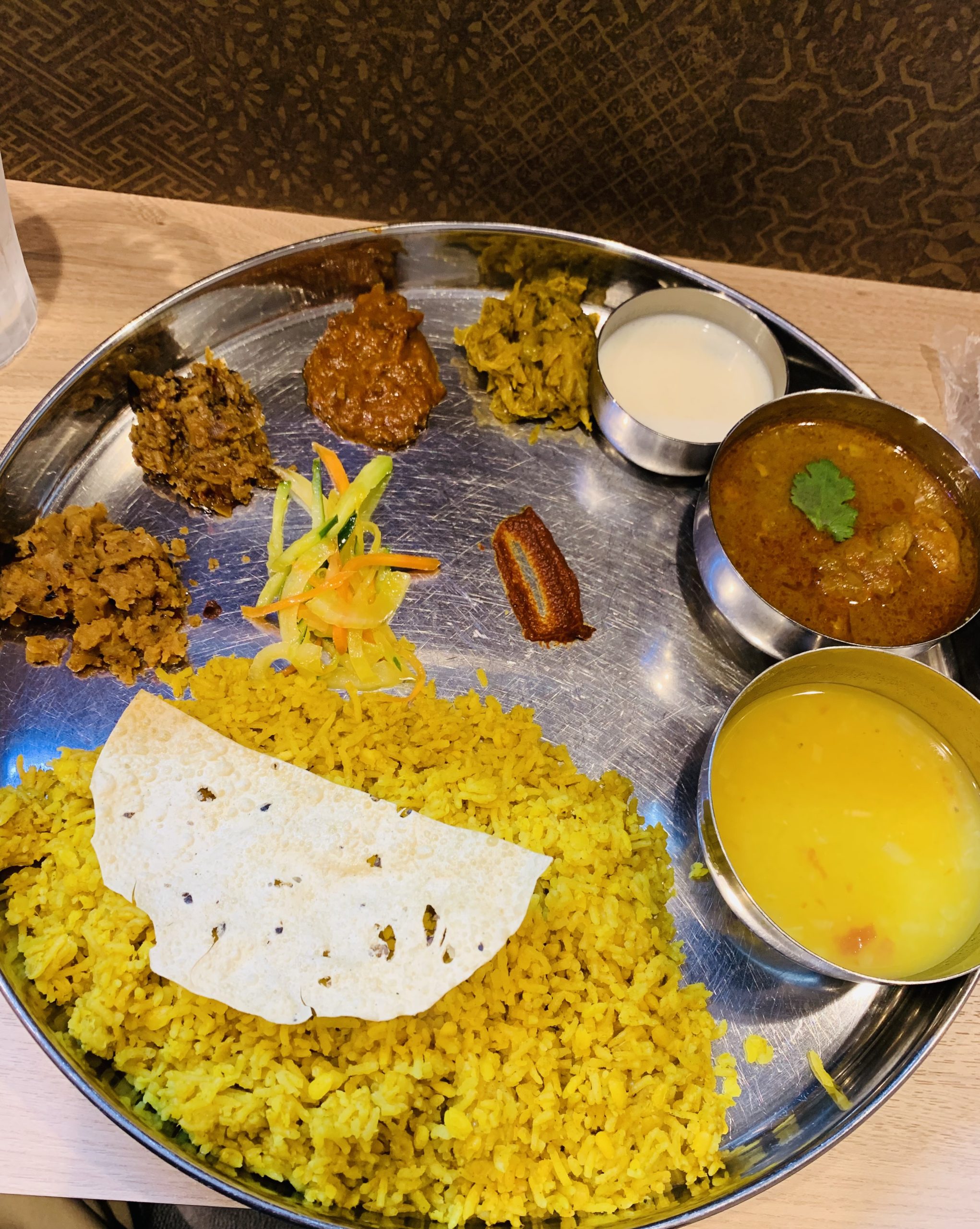 ミールスのような色んなものがさらに載っているものが複数種類から選ぶ形 かなり本格的に見える。 ボルタ・バジセットはボルタ3種類とバジ1種類にダルスープやカレーなどがお皿に並べられてる。 こういうのはあまり食べられてなく、一つずつ食べてるとシュッキボルタというのが激辛。カレー屋で舌が痺れたのは初めてかも。