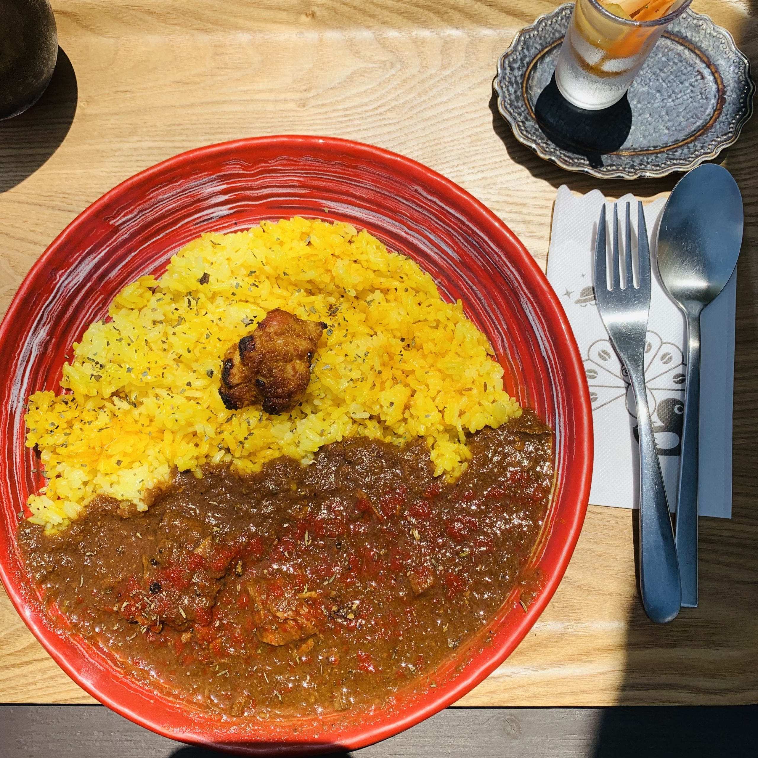 スパイスカレー店で店内がテラス席が選べるが、テラス席が開放感ありおすすめ。ライス、肉、ルー全部美味しい。スパイスふんだんに入っており、ライスにもスパイスかかっていて本格的。