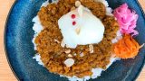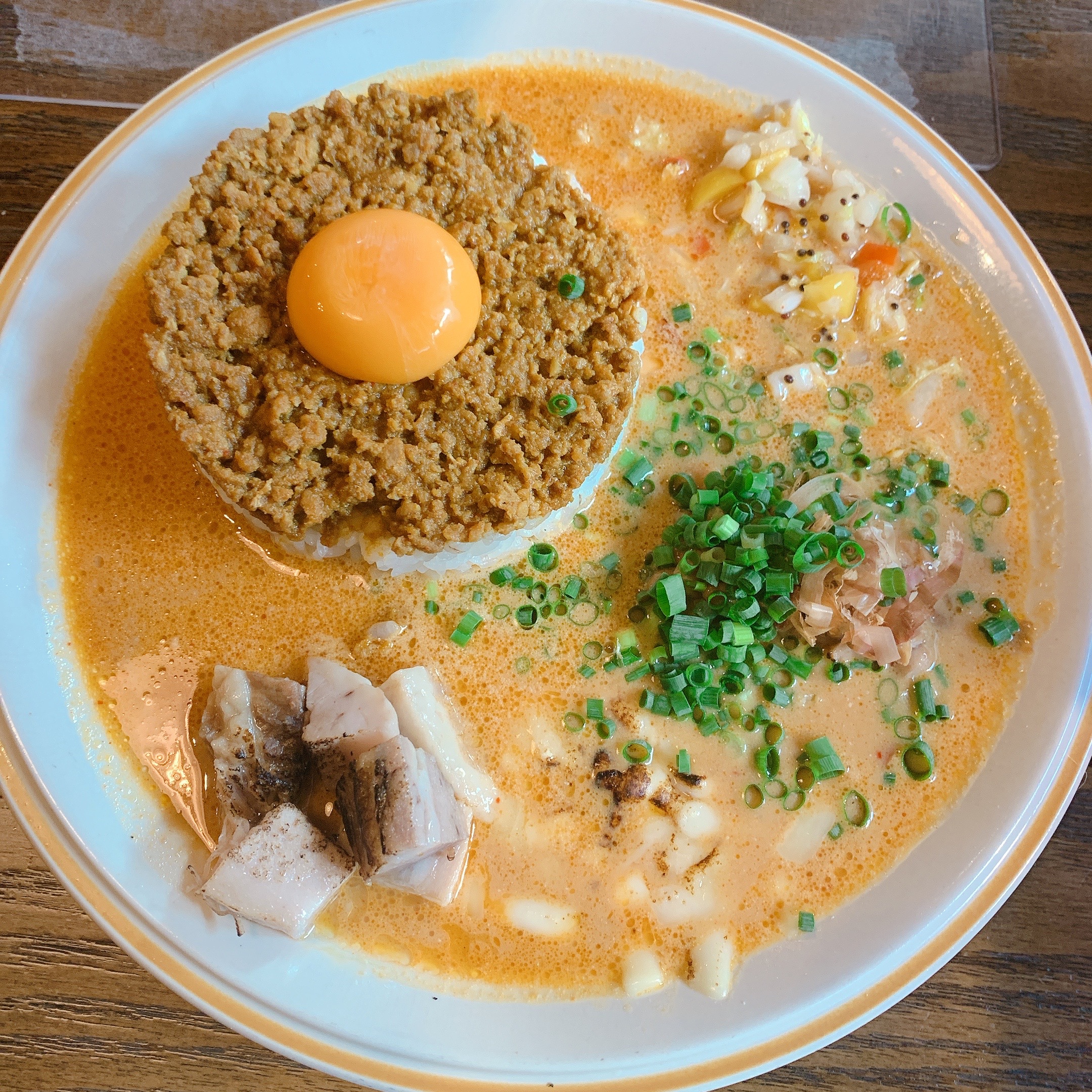 ランチタイムは混むかなと思い15時過ぎに行ったが、ほぼ満席の人気店 ここはココナッツがベースのカレーのようだが、パク森のようにドライカレーとの組み合わせが食べれる肉味噌スペシャル注文。 ココナッツが入ってるのでタイカレーっぽい味がするが、独特の味。納豆入っていて、以前CoCo壱で納豆トッピングした時は苦手だったが、ここのはよく合う。逆にもっと入れて欲しいくらい。肉味噌はかなり濃厚で、味がかなり好み。これだけで飯何杯でもいけそう。肉味噌ダブルくらいいきたい感じ。いろんな味が口の中で合わさって何度も味変出来る。名前の通りスペシャルなカレー