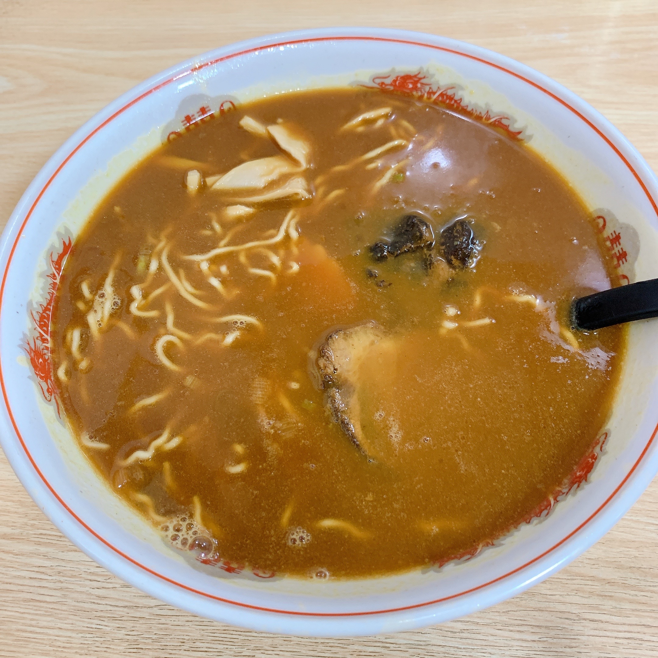 昭和感のあるラーメン屋。客は多く人気店。ディスプレイには絶対無理なちょーデカ盛りも飾ってあって、量や麺の硬さ、スープカスタマイズも豊富そう。濃いカレー色のスープの沼に埋まっている感じ 味は塩味が強くカレー感より、勝ってる感じ。麺が自家製の縮れ麺でスープともよく絡む チャーシューも厚めで美味しい。昔ながらの味といったところか。