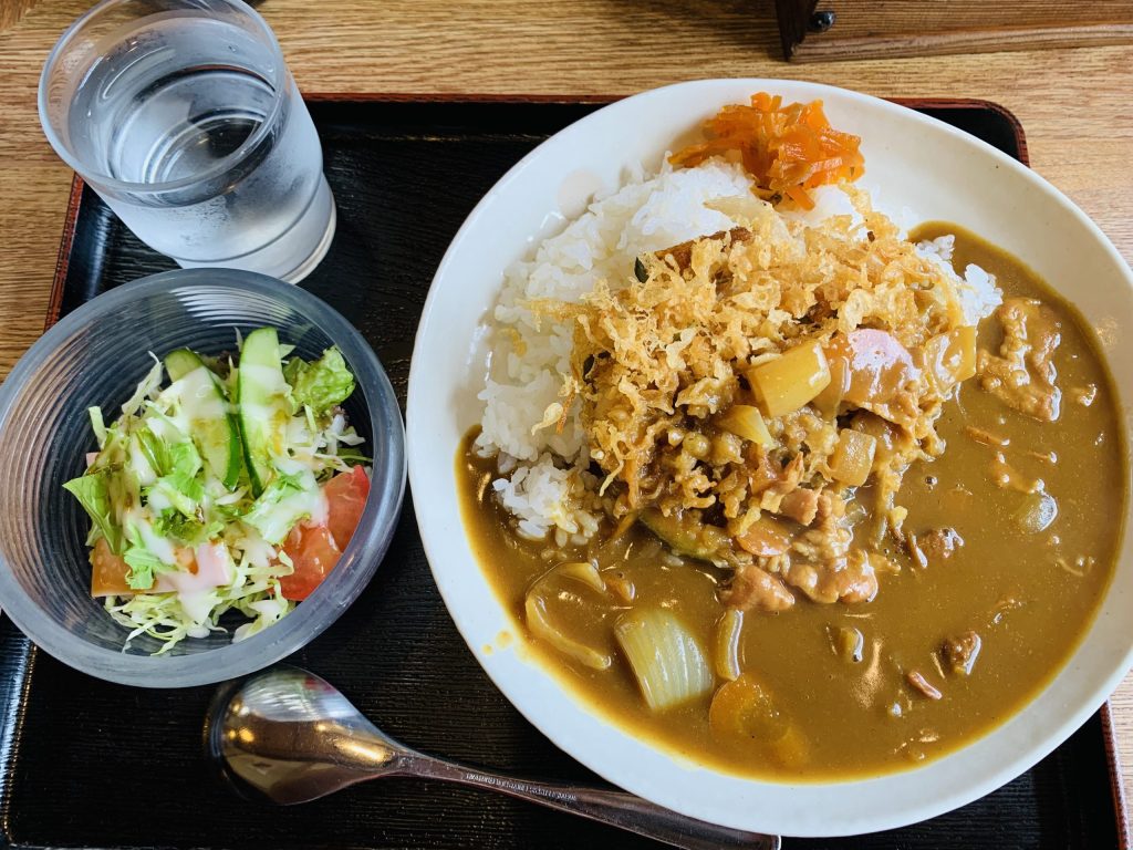 そば屋ならではの組み合わせだろうけどかき揚げカレーというのがありカレーとかき揚げの組み合わせは食べたことなくて、頼んでみた。 蕎麦屋のカレーはとろみ強すぎてあまり好きになれないが、ここのはそんなこともなく、さらっといけて美味しい。見た目はかき揚げミスマッチだが、食べてみると衣がフライドオニオンみたいな感じでいいアクセントで合う。
