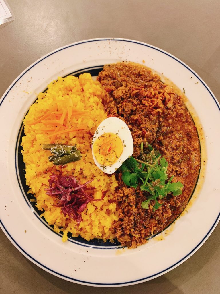 ランチはカレーメニュー充実していて、どれも見た目美味しそう。 頼んだのは、花山椒スパイシーキーマ 完全なドライタイプでは無い。山椒は最初なんともなかったが、後からじわじわくる感じ フライドオニオン?刻んだのも入っていて いいアクセントなっていた。