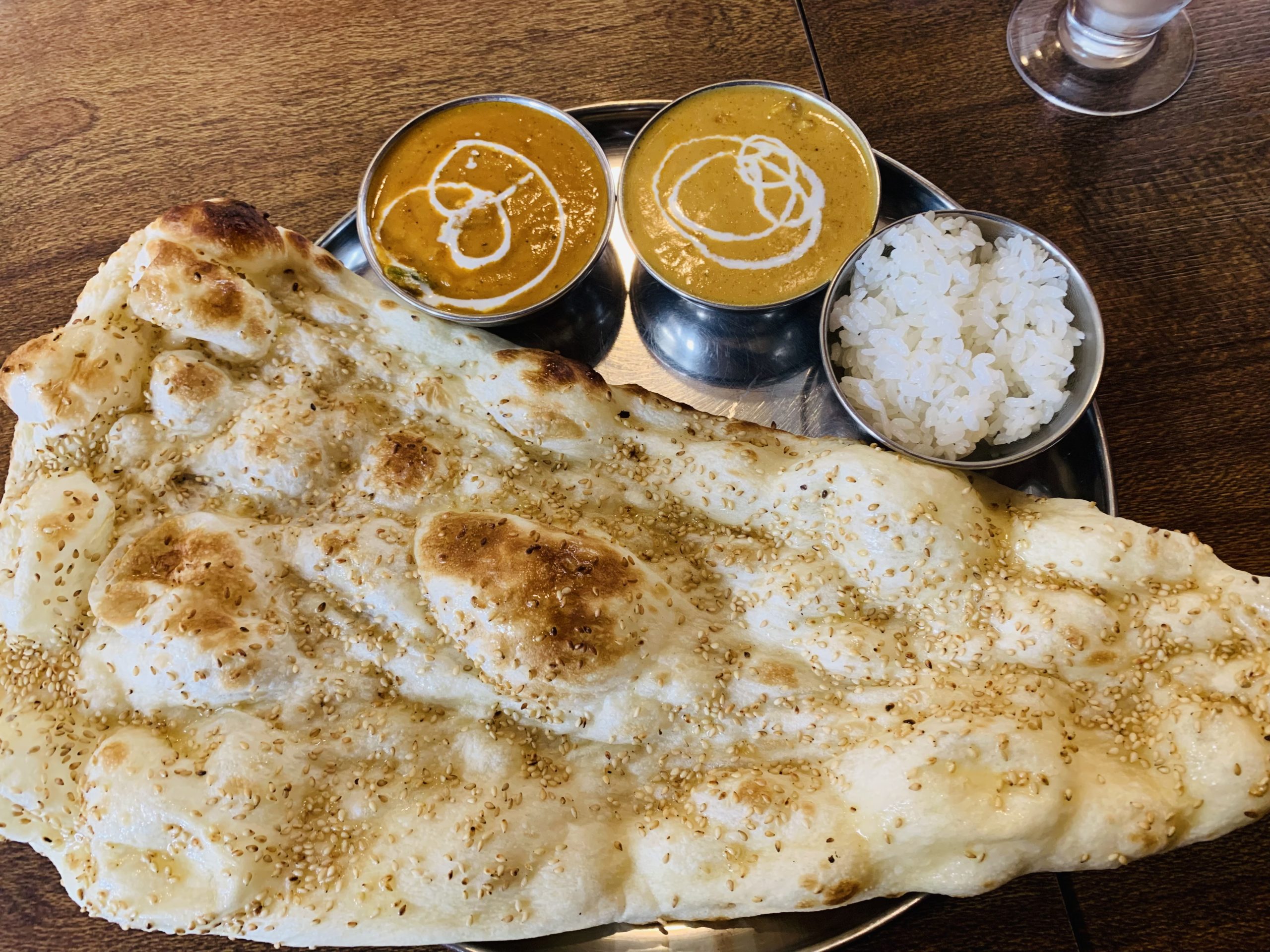 典型的なインネパ系メニューだが、ここの特徴は複数のナンが食べ放題なこと。ゴマナン、チーズナンとか5種類くらいある。 カレー2種類と、サラダ、ナン、ライス、ドリンクがつくマリカセット頼んでみた。ナンはゴマナンで。ゴマが大量に振りかけられており焼けた胡麻が香ばしくて、匂い、食感もいい。ルーは少し甘めな気がするので、辛口にしてちょうどよかった。