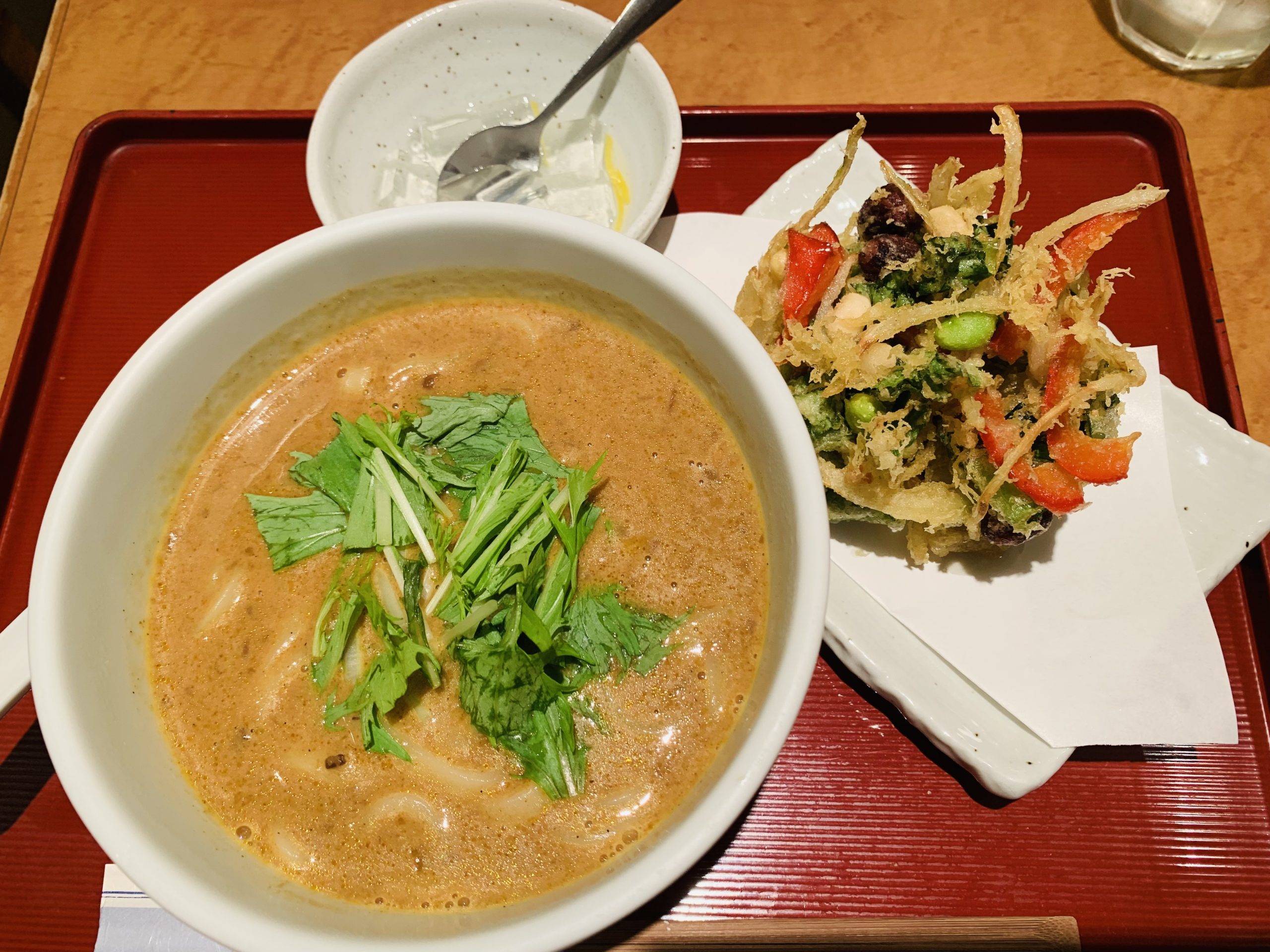 カレーうどんが主体だが、値段ちょっと高い。カレーうどんは最低でも1000円オーバ 限定の季節のかき揚げ天ぷらカレーそば。1680円頼んだ。すごくまろやかな感じでスルスルと入っていく。ちょいと甘めかな。かき揚げは具沢山で豆系が多め。麺、スープ、かき揚げ一つ一つは、不満はないが、 カレーうどんはもう少し気軽に食べたい。