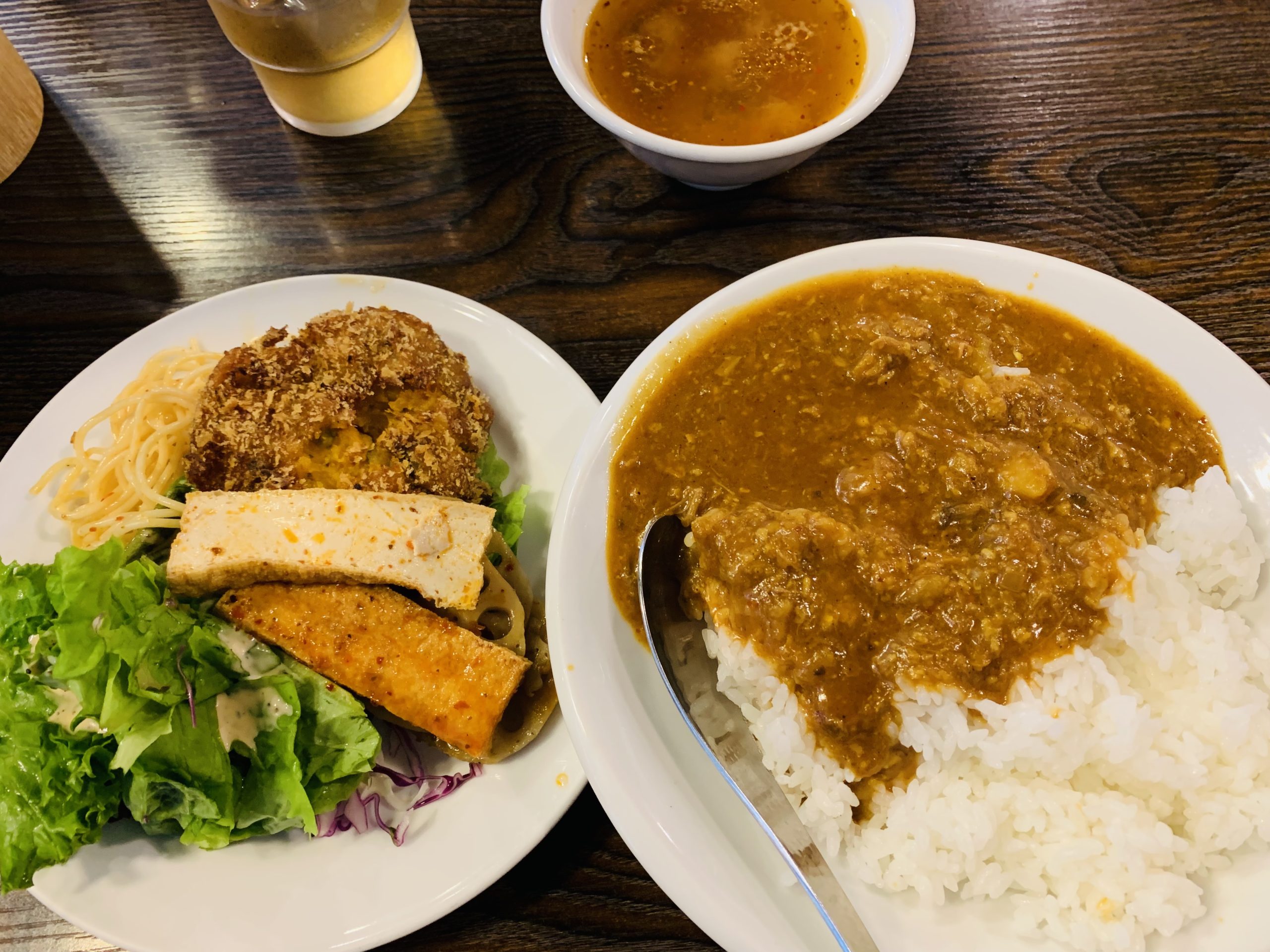 ここのランチは890円で、サラダバー付きでコスパ最高。サラダバーといっても、サラダだけでなく、惣菜が色々ありこれだけでお腹いっぱいなる。カレー頼んでみたが、とろみ多めで麻婆カレーといった風味。惣菜でお腹いっぱいなりすぎて苦しかった