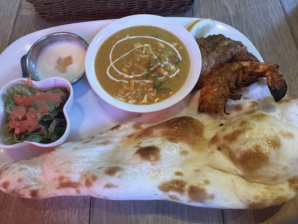 喫茶店のような店内で明るい雰囲気で家族連れが多い 通常の店とはちょっとメニューが違い、聞いたことないようなカレーもあった。 チキン、カシューナッツ、タマゴの入ったチキンジャンジリ頼んだ。 想像とはちょっと違いカシューナッツとタマコはみじん切りされており、具材と食感がちょっと低下原型で入れてくれた方が良かったかな。ルーはマイルド濃厚で美味しい。ナンも良かったが、セットでついてきた、チキンティッカっとプラウンが、サイズも大きく、スパイスがすごくあっていて今までの中ではトップクラスで美味しかった。