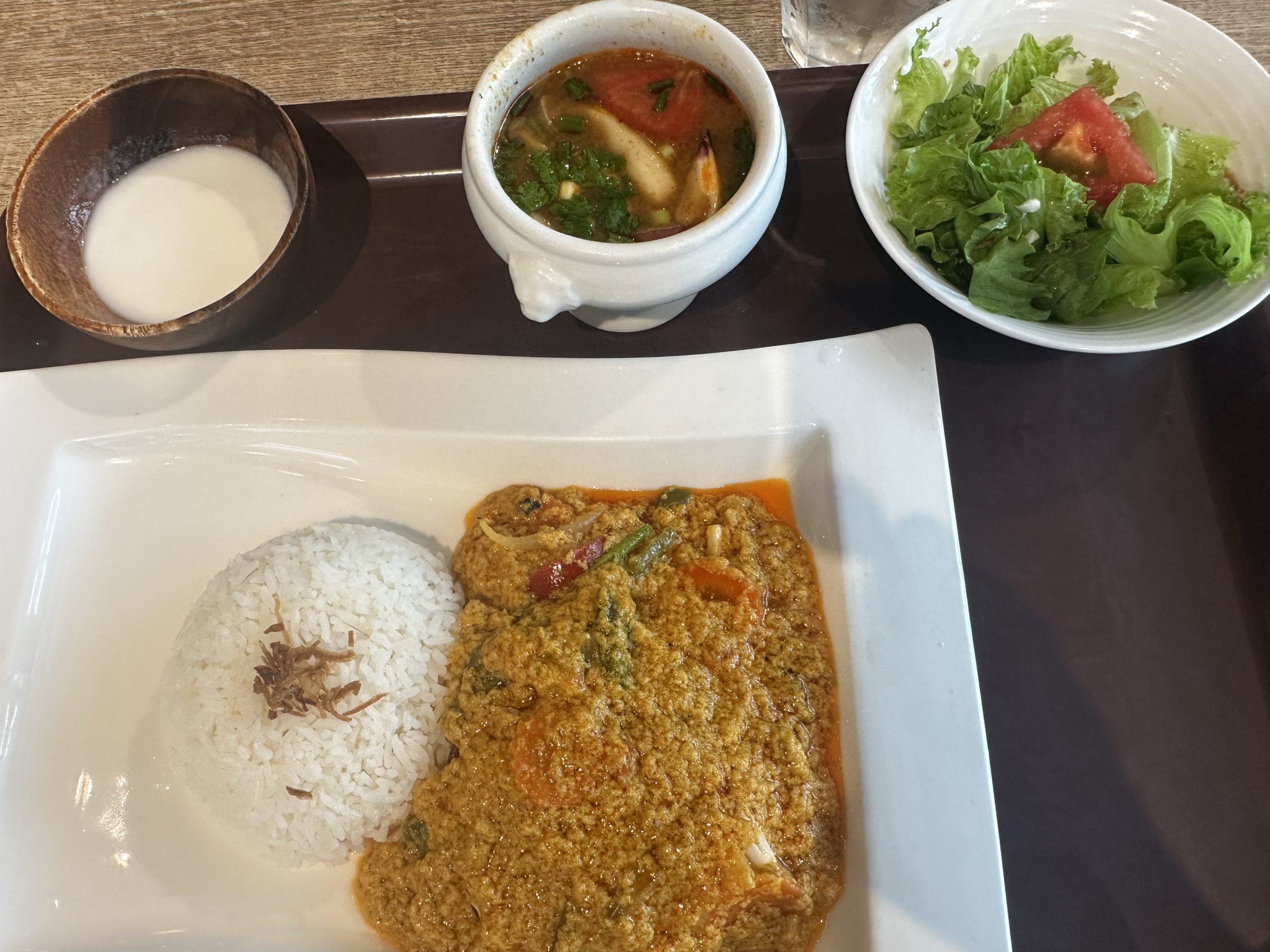 いつもならグリーンカレーだが、限定でバッポンカレーセットあったのでそちら注文 写真では、具の量がすごかったが、出てきたのは卵多めで具が見えない。でも味は良かった。海老もサイズ大きめです。 小さいトムヤムクンも付いてきて量も満足