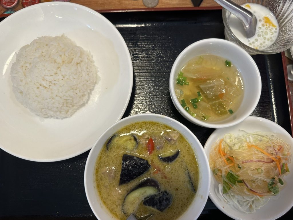 なんとなく現地っぽさ漂っていて、いい雰囲気。まずは定番グリーンカレーから。 サラダ、ライス、スープ、デザート付いて1050円。 サラダは、普通のキャベツの千切りかと思ったら、酸っぱい春雨が入っていて独特な感じでこれ家でも作りたくなるシンプルだがやみつきなりそうな味 カレーはかなり具沢山。甘すぎず辛すぎずちょうどいいバランスで、ジャスミンライスとの相性がいい。