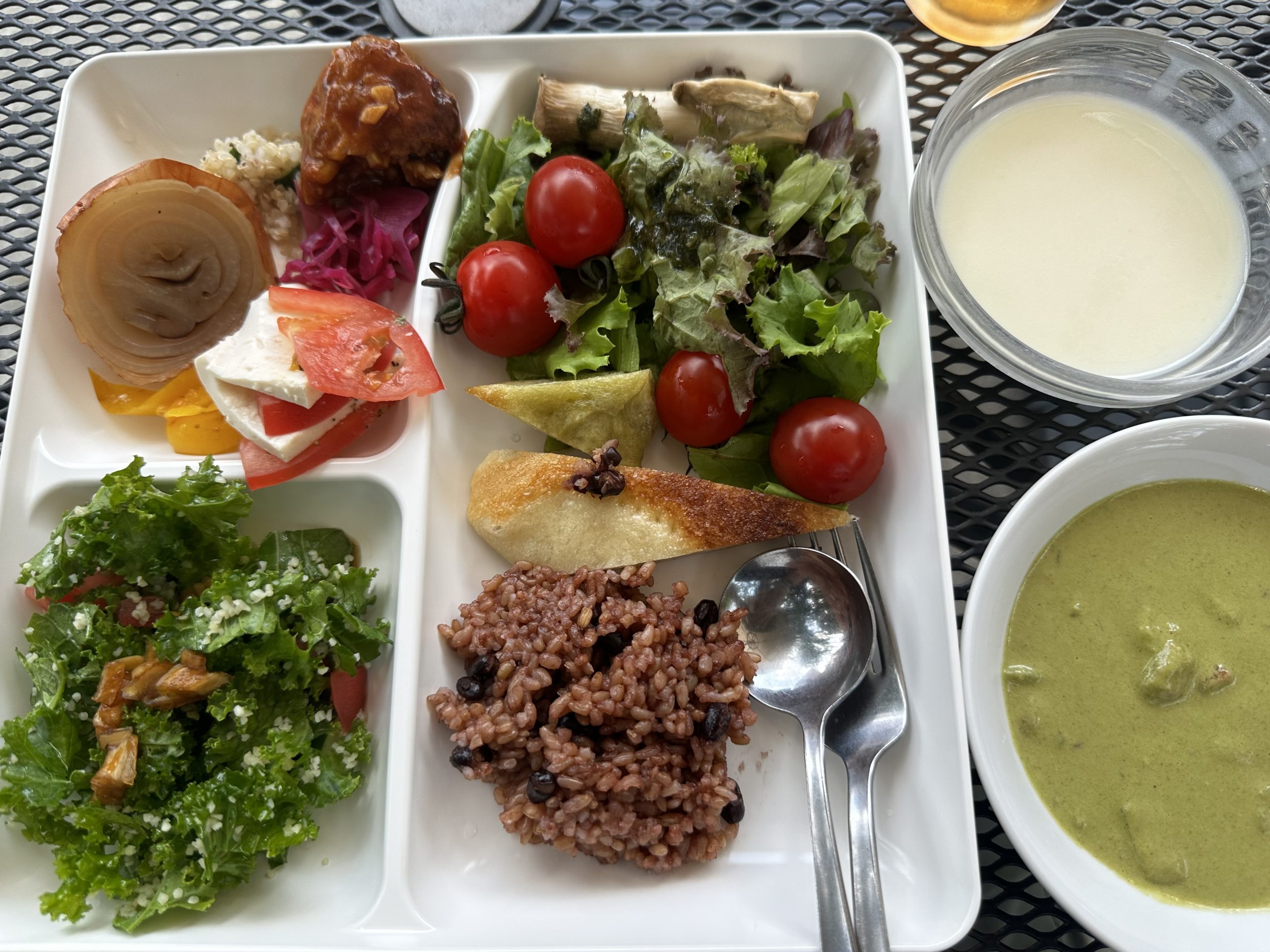 野菜のビュッフェの店。店の庭で作ってる野菜出しているみたい。野菜の種類はぁり多く無く、よく見る野菜が多いが、シンプルで美味しい。 まぁまぁのお値段(2500円)なので、珍しいお野菜があると嬉しいかも。 元がとれるほど食べれなかったが、普通のビュッフェより健康的でいいかも。