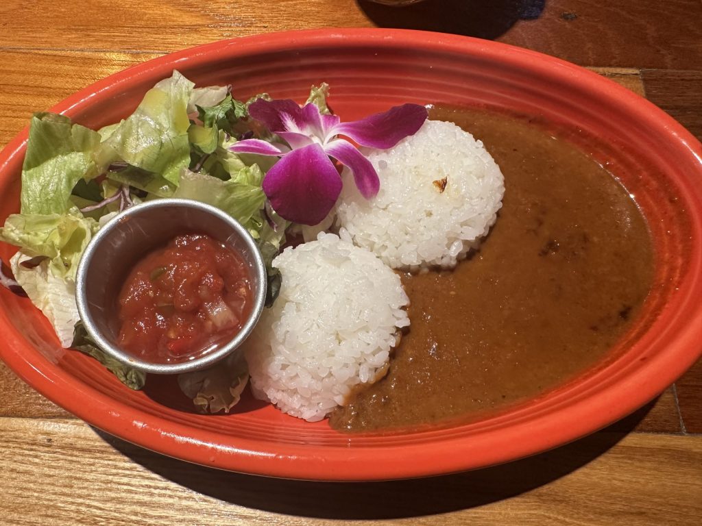 内装はかなり雰囲気ありで椅子もふかふかで居心地いい メニューはハワイアンしてます コーヒーだけ飲むつもりが、カレーを、見つけてついつい頼んでしまった。 ココナッツベースのカレーだが、タイカレーと違ってかなり甘め。追いスパイスで辛さ調整できるとよかったな