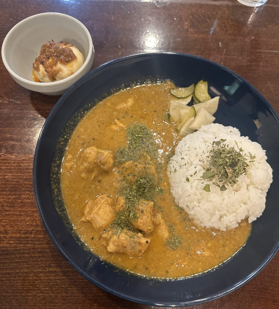 餃子屋に人が並んでいたので行ってみるとまがりカレーの店だった。 ワンオペなので、時間はそれなりに覚悟。 メニューは、週替わりの一品+トッピングオプション 今日はジンジャーチキンカレーの日 オプションに中華風煮卵つけた スパイスとハーブがふんだんに使われており香りがいい。味はスパイシーながらも柔らかい感じのカレーだった。調合がうまい。並ぶのも分かるな