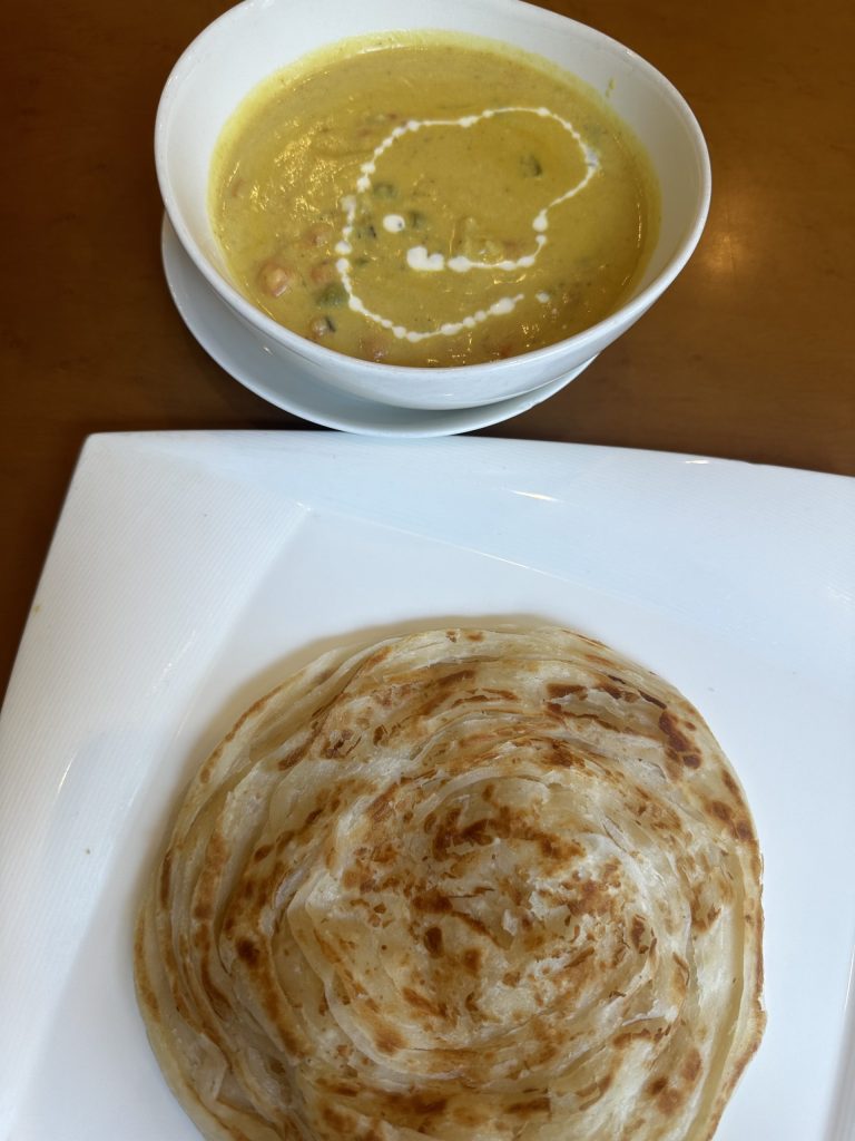 南インドカレーの店 ミールズもあるが、単品すごく充実 ビーフ系メニューもありビーフケララすごい美味しそうだったが今日の身体はベジタブル求めてたので、ベジタブルクルマにケーララパロタ。 ケーララパロタは初めて食べたが、デニッシュパンのような生地が何層にも重なったようなふわふわでカレー乗せにくいが味の相性はいい。 ルーは量も具も多くココナッツのまろやかさとスパイシーさが混ざってちょうどいい。スパイシーなクラムチャウダーのような感じ