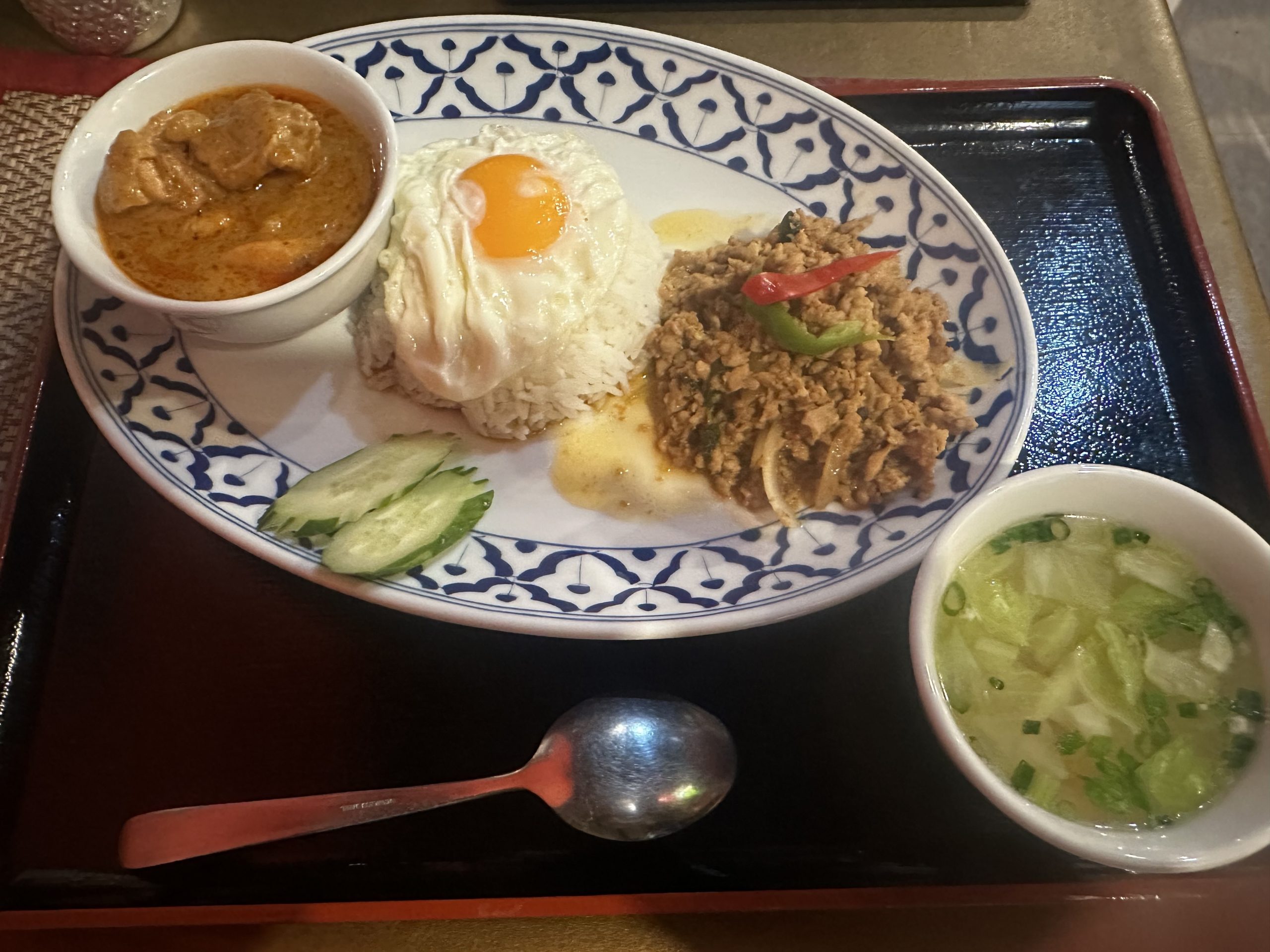 2種類から選べるセットがあり、いつもガパオライスかカレーかで迷ってしまうのでよかった。 味付けは辛味はほとんどない。ガパオはもう少し唐辛子入ってる方が好きかな