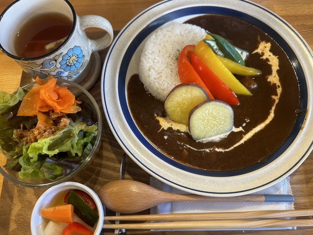 店内は結構広めで、木材テーブルと椅子でとっても綺麗 ルーの中に出汁が入ってるのか優しい味。サラサラ系のルーです。トッピングにかつお節と高野豆腐というところがいかにも和。サラサラ系はあんまり得意じゃないが、ここのは結構スパイス効いててよかったかも。