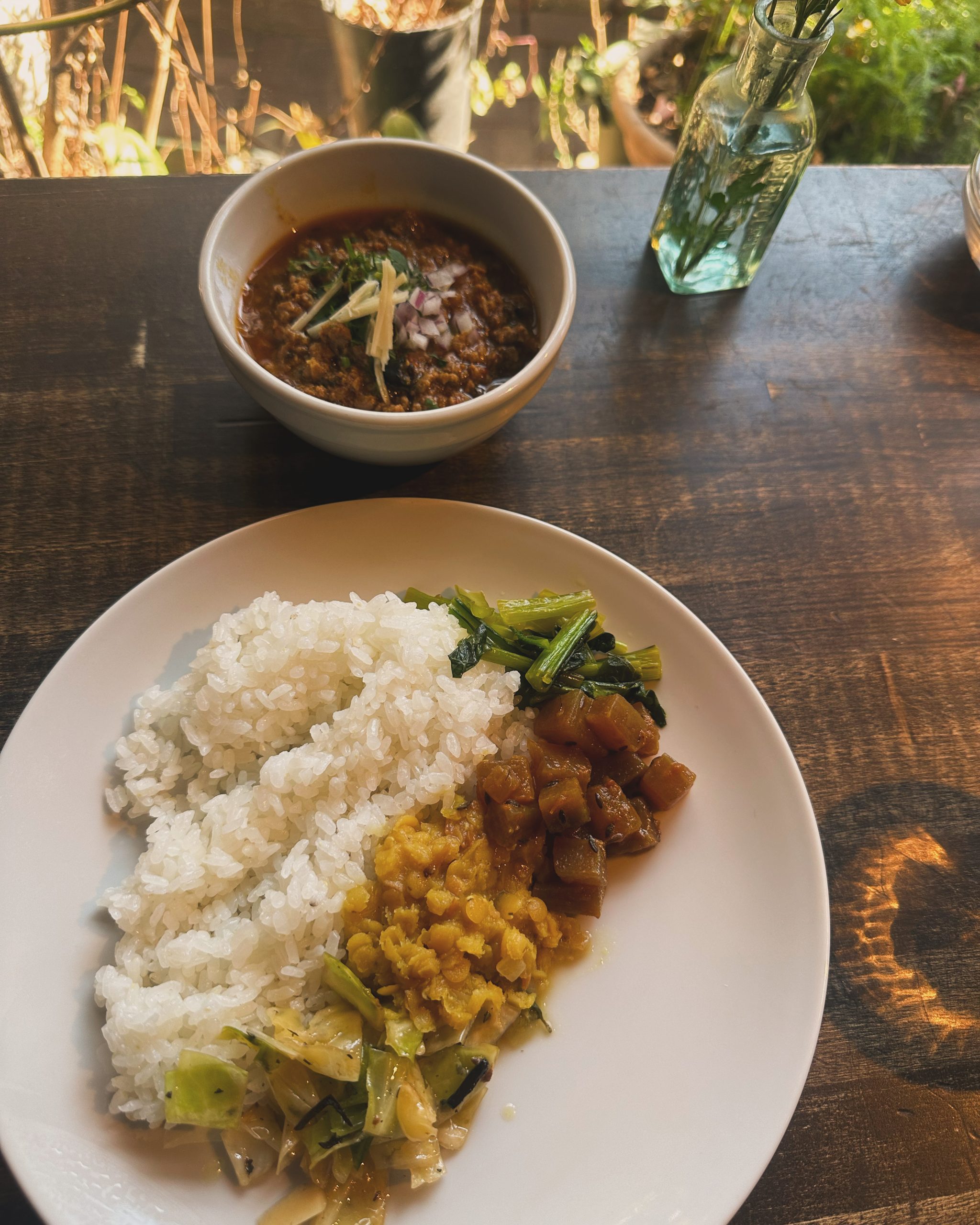 住宅街の中で気づかず通りすぎそうな場所にある ランチはメニュー8種類ほど、ほとんどの人が二種盛り頼んでたが、キーマ好きなのでラムキーマ一本 ドライではなく少し水分多めのセミドライ。山椒入ってると書かれてたが、そんなに強めではなく全体的にマイルド。いっぱい付け合わせ乗ってるので、色々味楽しめていいです