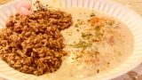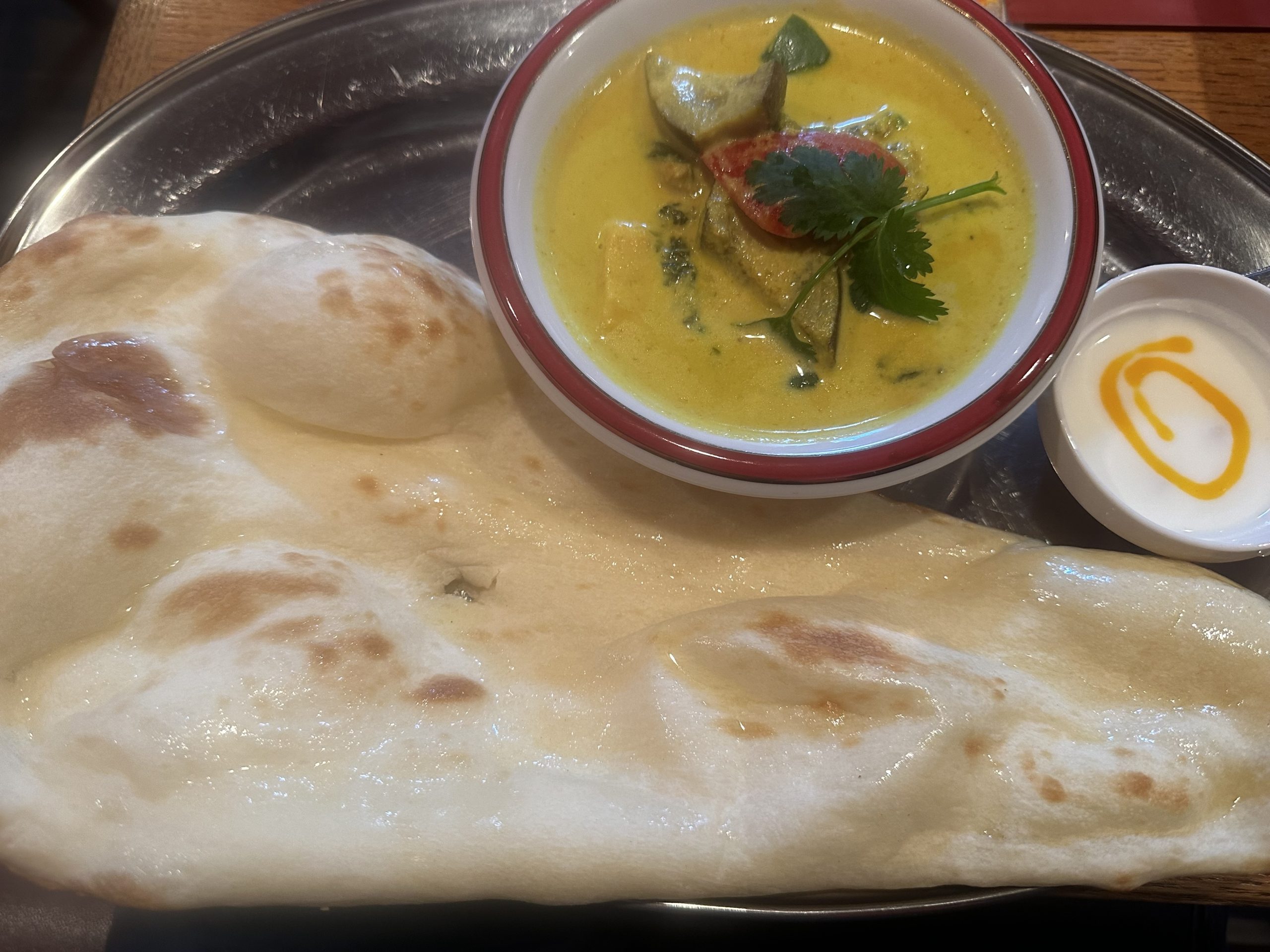 インド&タイカレーの店 地下にある店だが中は結構席数多かった。 インドカレーの店でタイカレー頼むとサグカレーが出て来たりなんか違うというのが多いが、ここのはちゃんとしたタイカレーで専門店並み。チキンもかなり大きく食べ応えある。いつもはタイカレーはライスだが、今回ナンで食べてみた。この組み合わせも合いますね。 ここの女性の店員さん顔見ないと日本人かと思うくらい日本語発音うまかった。