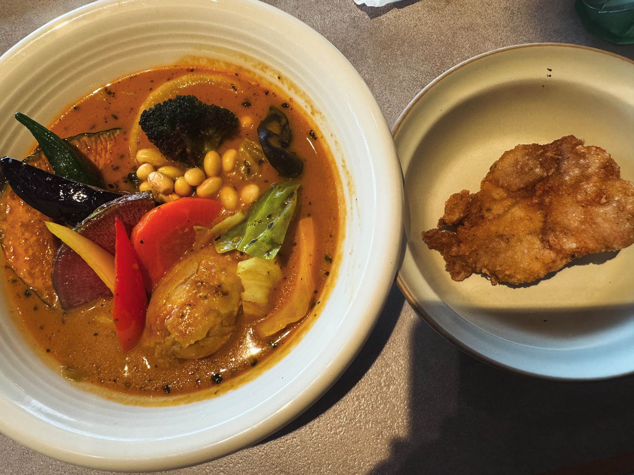 最近スープカレー比率が高い ここテラス席もあり前に何も無いので奥の方の席は見晴らしはいい ここはトッピングが好きでたまにくる。大きめなキクラゲ、ザンギ、ごぼうが特に好き。