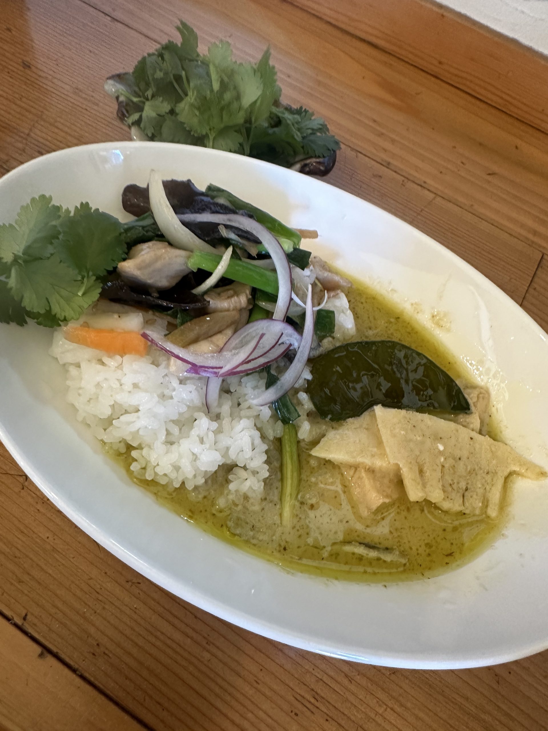 厚木から宮ヶ瀬湖行く途中にあるタイ料理の店 まわりはなんもなくて、ポツンとある感じ ガイパッキンとグリーンカレーの珍しい組み合わせのガイグリというメニューがあったので、こちら注文。カレーはシャバシャバ系で、最初の印象はマイルドすぎるかなと思ったが、後からじわじわと辛味がガイパッキンと混ぜて食べると美味しい。追いパクできるのも良かった。
