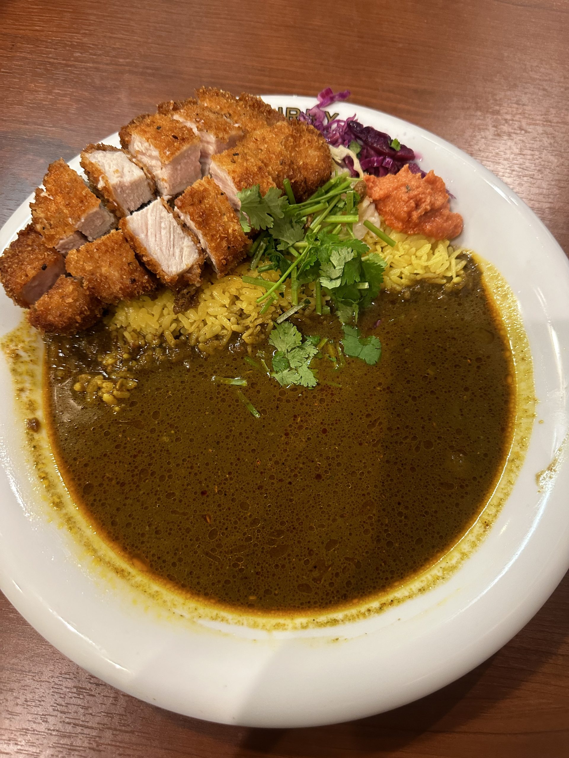 本店閉まってたのでこちらへ 土曜日12時少し前だったが並ばずに入れた。 内装はパーみたいな雰囲気。お酒もいっぱい置いてあり、夜は飲めるのかな? 提供は結構時間がかかるのでお腹すかしながら待ちます。頼んだのはスパイスとんかつカレー ルーはシャバシャバ系でスパイス効いてます。とんかつは脂身少なめなのでちょっと硬さがあるが、このカレーには合ってるかも。
