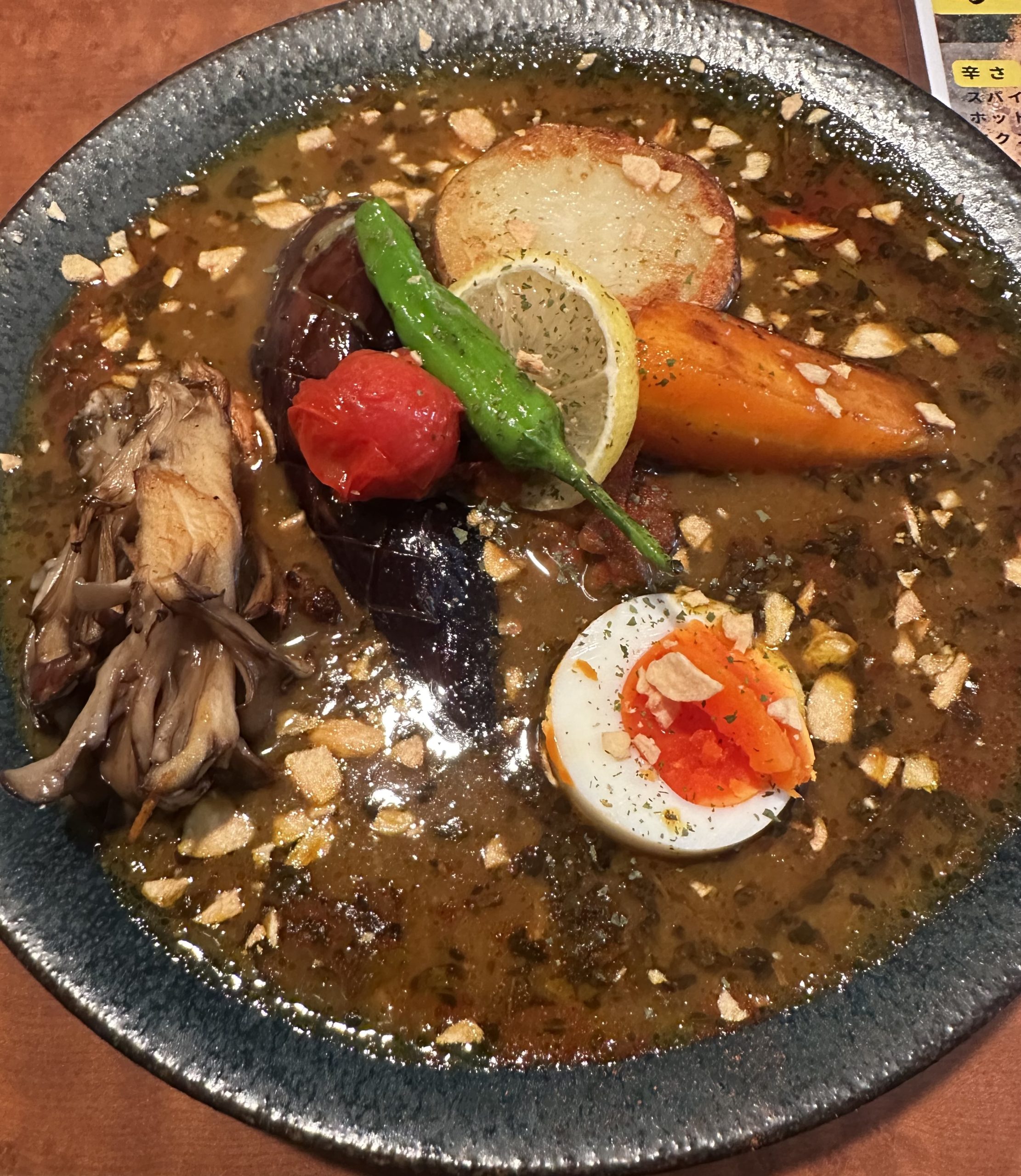 バーの間借り店みたいで、店内はカウンターとソファ この日はレモンバジルとココナッツバジルからセレクト。 スパイスがふんだんに使われており、スパイスカレーの店よりスパイシー感強め。レモンかけて食べると味変できる。野菜の素揚げが美味しく、当たりのスープカレー店だった。