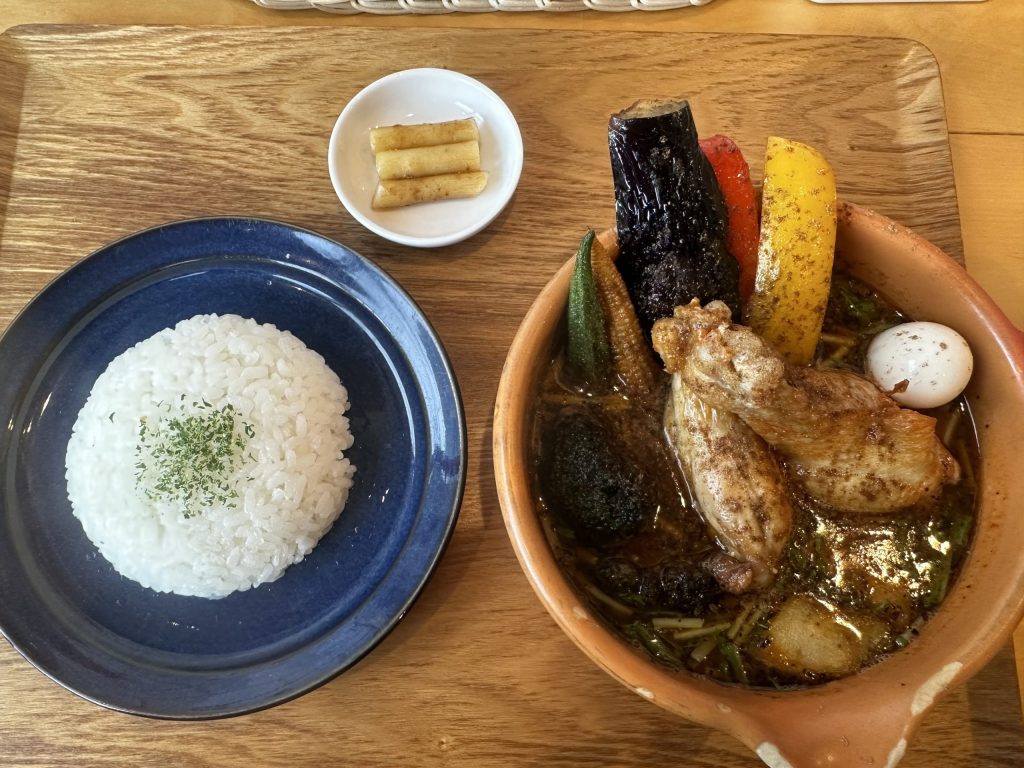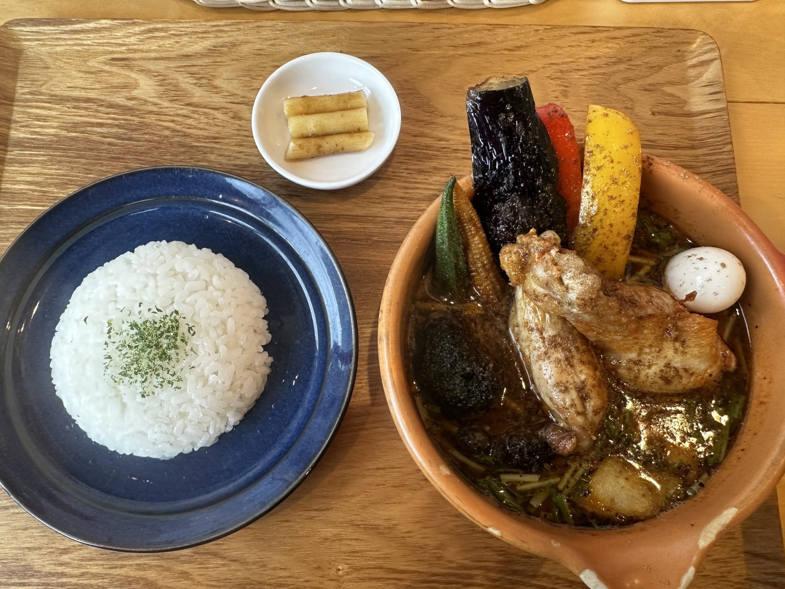 京都っぽい和風な名前の店名惹かれて行ってみた 中はポップな雰囲気だった。 結構人が、ならんでおり、人気店なんかな 頼んだのは手羽元スープカレー。 野菜がたっぷり入っている。ルーは今まであまり食べたことないタイプのスープカレー。スパイス感強めで新鮮味があった。肉は旨味があって美味しかったです