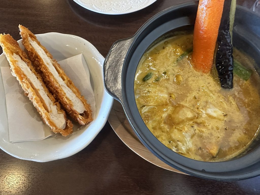公園の隣にあるスープカレーの店。公園の雰囲気に合う店舗です。 最初ちょっと高いかなと思ったけど、内容見て納得。サラダビュッフェ付いてきて、ライス、パンおかわり自由。ルーまでおかわりできるのはすごい。逆にコスパいいかもと思った。 ルーの種類は豊富で、5種類ほど。トッピングが、いつも行くスープカレー店とはちょっと違い、和牛やフライ系も充実していて珍しい。せっかくなので、食べたことないトッピングで、ささみチーズ注文。フライが別皿で出てきたのがよかった。サクッと、スープ吸わせる両パターン味わえる。スープは北海道系で、美味しい。