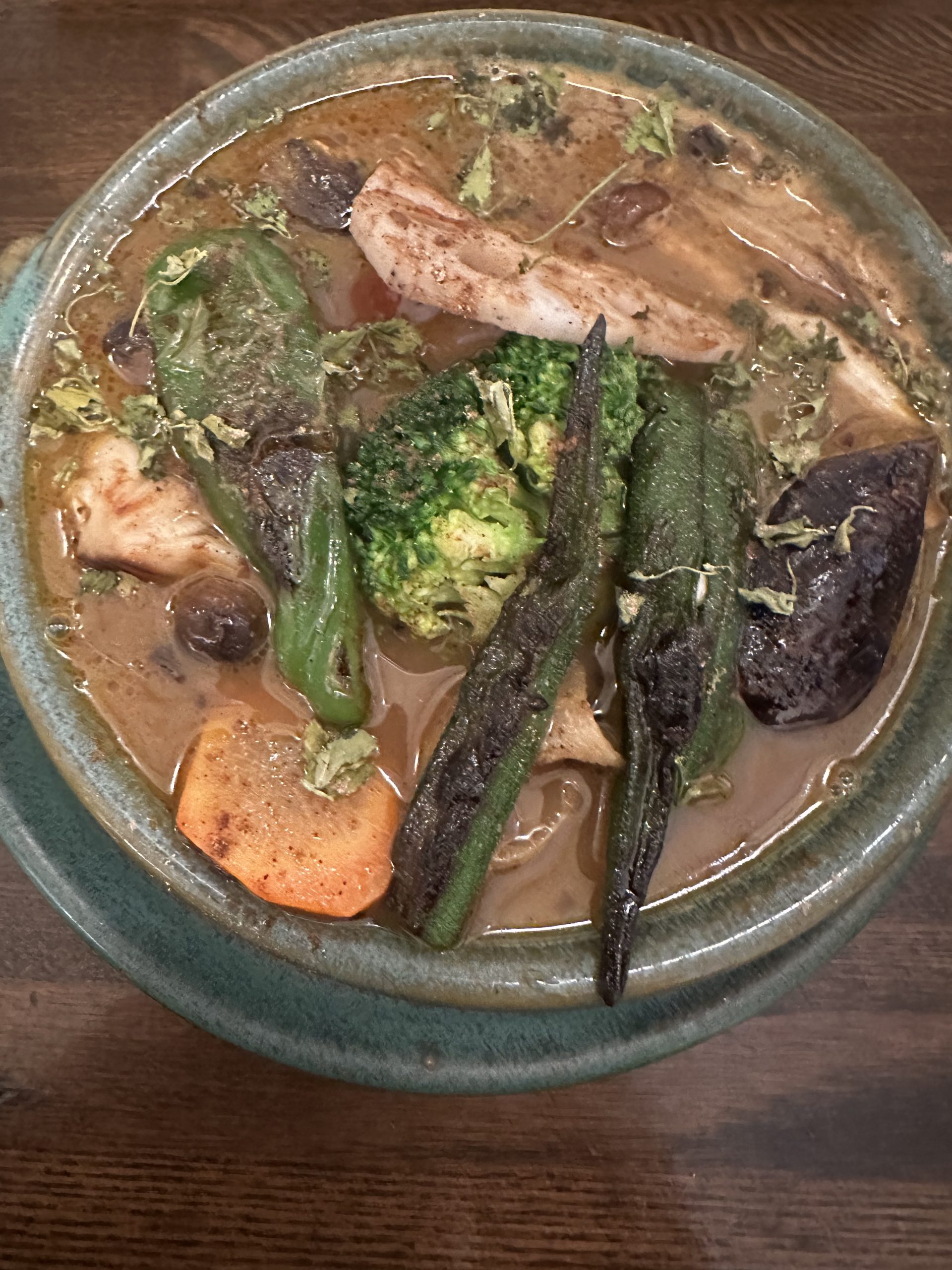 カウンター前にはスパイスの瓶がいっぱい並んでいて、色々調合してそう。 初めての店では、いつもキーマから入るのだが、限定のスパイススープカレーが気になり、そちら頼んでみた。運ばれて来るとスパイスのすごい匂い。かなり入ってます。野菜もたっぷり入ってるし、豚バラ肉もたっぷりで食べ応えがあった。ここまで、スパイス使ったスープカレーは珍しかったので頼んでよかった。
