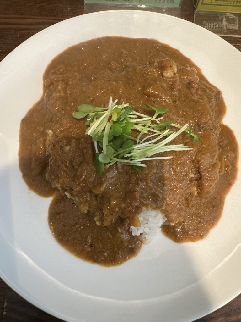 メニュー数は5くらいだが、色んな系統のカレー(インド、欧風、スープ)があり値段がすごく安い。3種盛りでも1000円切る安さ。どれか迷ったが、キーマ系で、ひき肉とほうれん草のグリーカレーチョイス。 ひき肉入りのサグカレーみたいなものかと思ったが色自体は茶色ほうれん草が入ってるからグリーンカレーみたい。上にはかいわれ大根なっておりこれがいいアクセントなってた。ほうれん草の味は強すぎずまろやかな味だった。オリジナリティあります。付け合わせのピクルスも美味しい