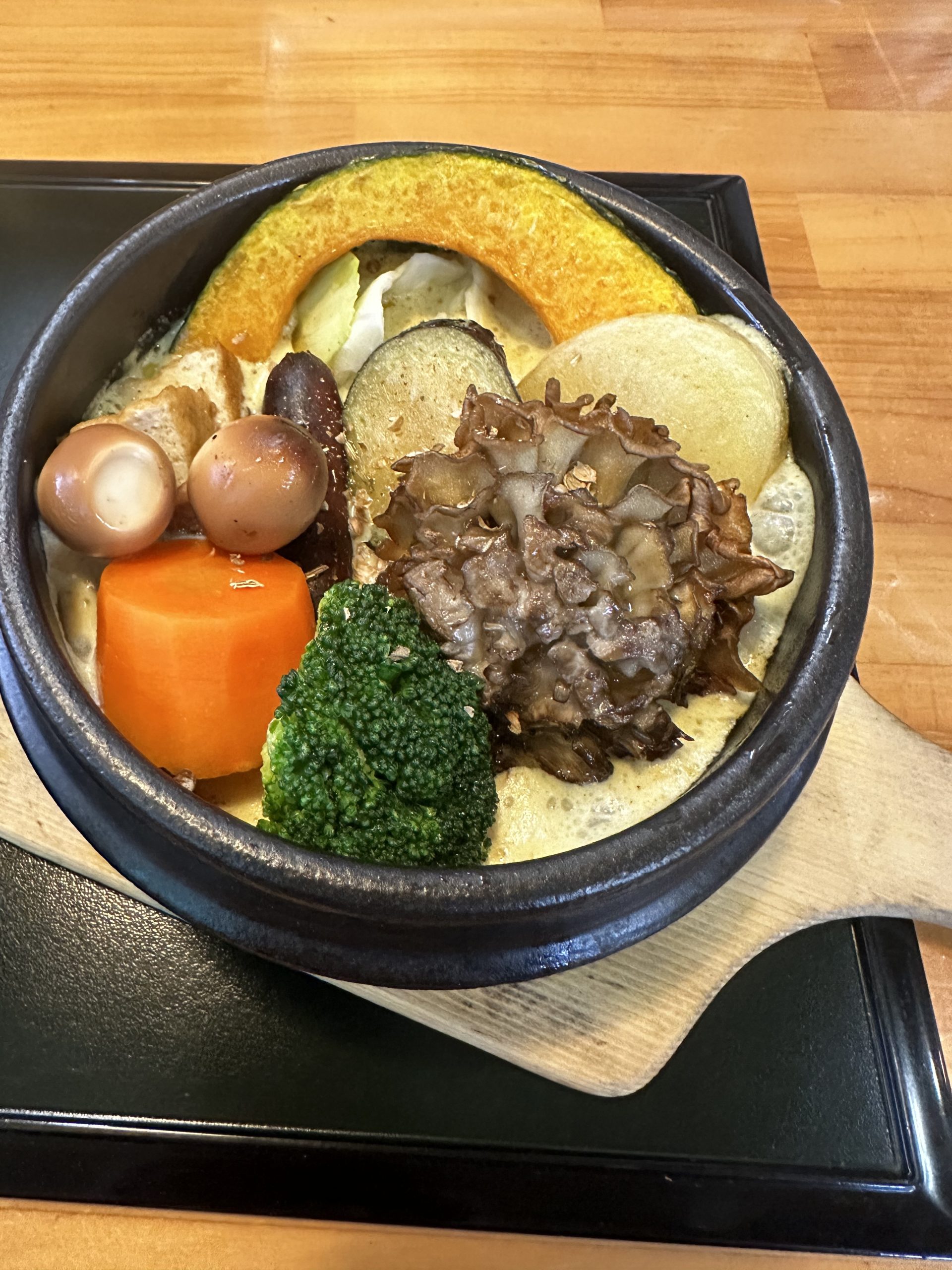 青梅でスープカレー専門店珍しい。 一部地元のものも使ってるみたい 燻製した具材があるのが珍しいかったので燻製入りメニュー注文 スープは4種類。辛さは選べず、テーブルのマサラで調整。値段は1000円以下だし結構お手頃かな。 グッグツ煮えたぎって出てくる。具の量がすごく多く食べ応えもあります。 ココナッツのスープ選んだが、すごいクリーミーで独特。燻製の香ばしく匂いと味感じられて良かった。 ライスは少し硬めで、スープと混ぜることを前提にしてるのか、混ぜて食べるとちょうどいい感じ