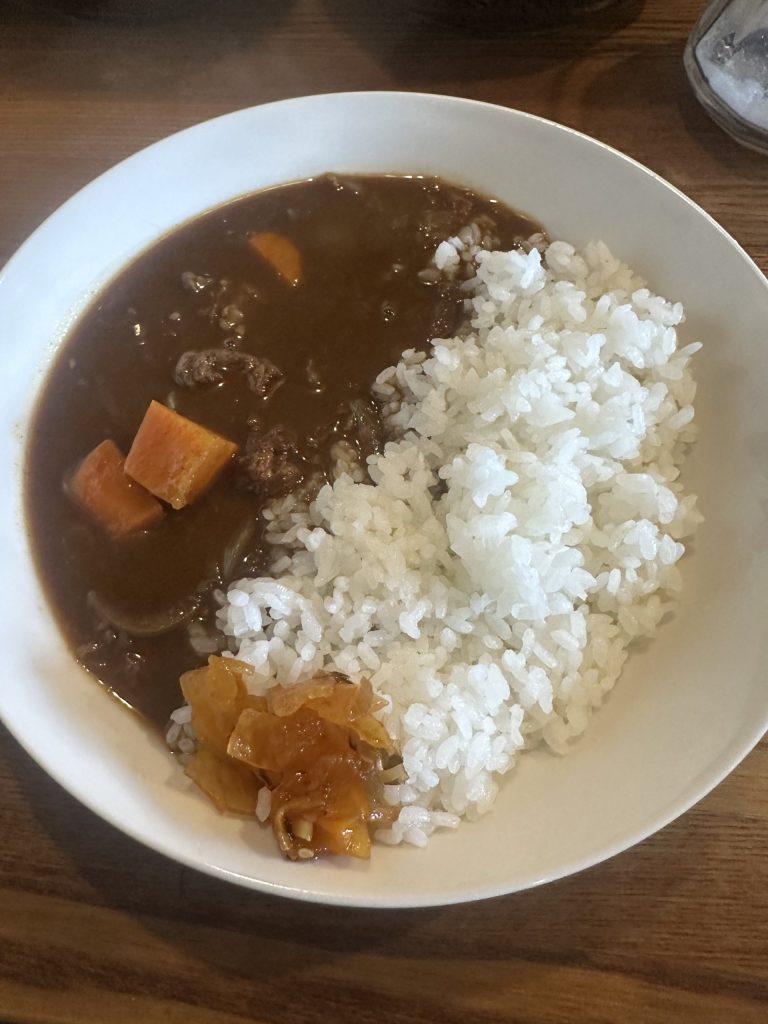 牛すじカレーののぼりが気になり入店 小さなカフェでカウンター少々とテーブル1つ。 おじさんマスターのワンオペです 注文はもちろんカレー かなりサラサラで、すんなり喉を通っていく。肉は思ったより入っており柔らかかった。ご飯がちょうどいい硬さで良かった。