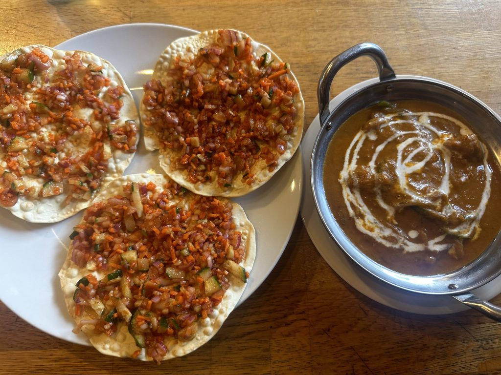ルーは濃厚で具沢山玉ねぎの甘さもあり美味しかったが、パパドが上に乗ってる野菜酢漬けがおいしくこれだけでも十分満足