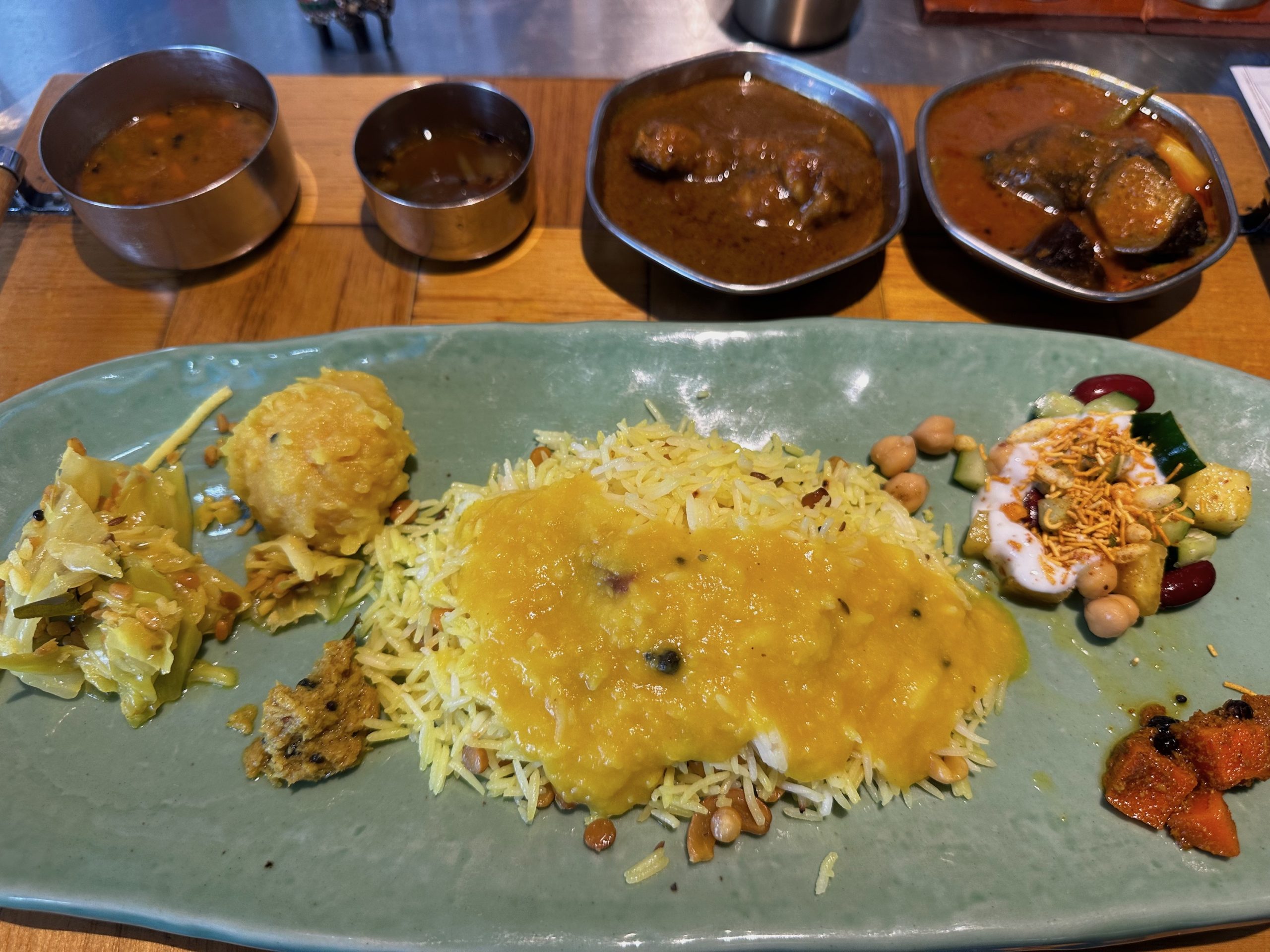 すぐ近くにRスリランカがあることに気付き、どっち行くか迷ったが、最初の予定通りゼロワンへ。どちらも混んでます。こちらは南インド系。ランチは少し変わったミールス。カレーは4種類くらいから何種盛りか選び、ライスは2種類(玄米、インディカ米ミックス or バスマティのレモンライス)から選ぶ。 お皿の上には、ポテトサラダ?、豆やパイナップルとかありヨーグルトと混ざってとっても爽やか。 カレーが濃厚ですが、後味がすっきりする。 LINE登録するとなんかおかわりできるみたい。