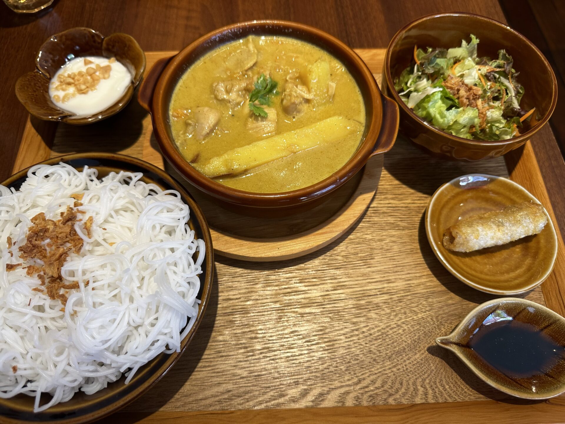 藤沢では数少ないベトナム料理食べれる店。 今回はランチ利用。 木がいっぱい使われており雰囲気のいい店です ランチは8種類 どれも美味しそうだが、まずはカレーから。 ライスではなくフォーがついてきてつけ麺スタイルで食べる 具もルーもフォーもたっぷりで量あり結構お腹いっぱい。ルーはココナッツベースで優しい味、ジャガイモじゃなくさつまいもというのもいいですね。つけ麺するとルーの温度が下がるので、もう少しルーが熱いと嬉しいかも。デザートも美味しかったです