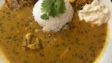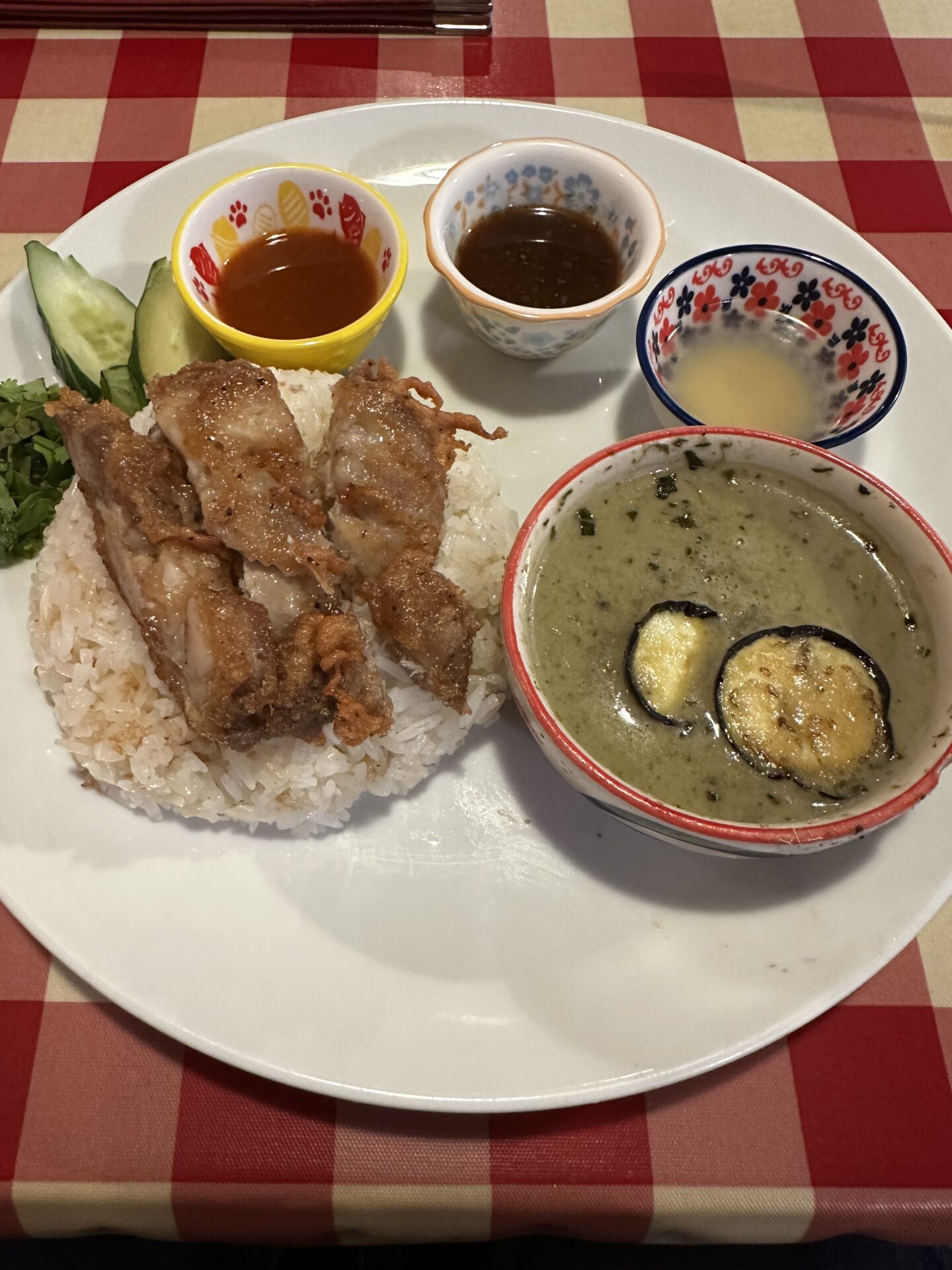 店名がタイっぽくないけど、雰囲気も料理も周辺のタイ料理の店の中でここが1番タイっぽい。 ランチは、ガパオ、カオガンマイ、グリーンカレーのコンビネーションでいくつか種類ある。 2種類選べるハーフ&ハーフチョイス。ハーフサイズずつですが、思ったより量はあった。 ガオガンマイはフライしたのも選べ食べたことないので、それとグリーンカレー。カレーは辛味はあまりなくどちらかというと甘め。ガオガンマイが香ばしく、タレも3種類付いてきて味変できて美味しかった。 バナナのフライとかもあり、この店面白いメニューが色々ありそうなので、今度夜来てみたい