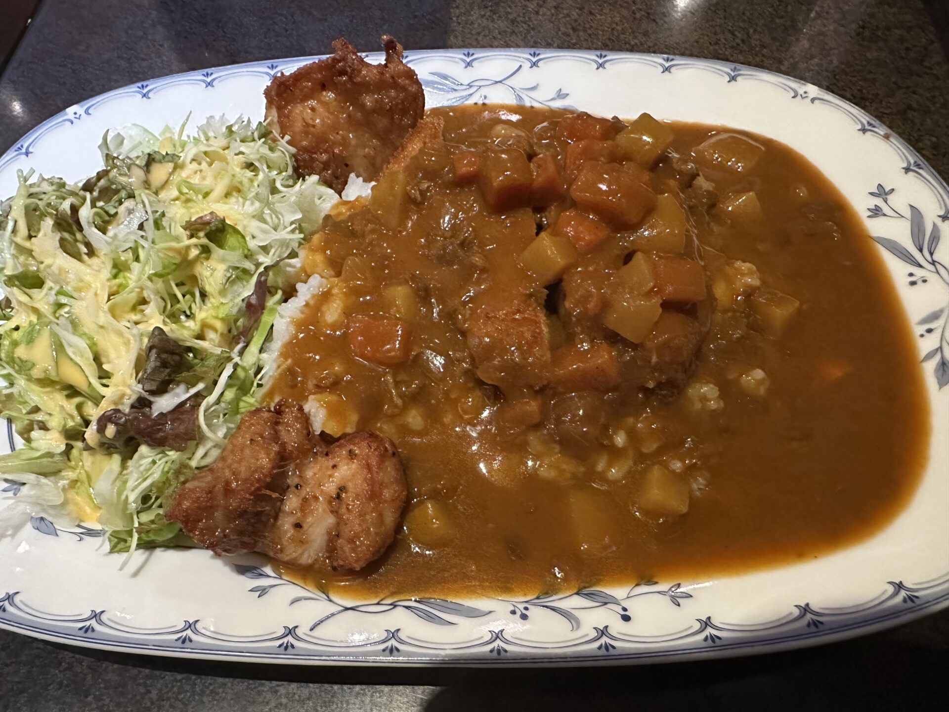 勝手な想像で小さいバーのような雰囲気なのかなと思ったけど入ると結構席数あって大勢入れそう。 デカ盛りカレーが有名らしいがそんな食えないので、小盛り注文 とんかつ&唐揚げミックスカレー。 ベースは甘めのカレーで、ガラムマサラ追いかけで調整。行ったタイミングなのか、揚げ物が揚げたて感なく残念。ルーは尖った感じはなく誰でも大丈夫そうな味です