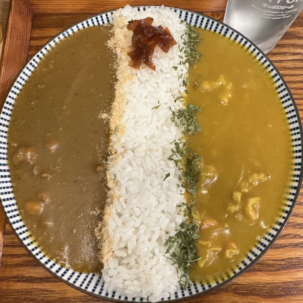ここはカレー専門店ではないですが、カレーの写真が美味しそうなので行ってみた。 一階が厨房と売店、2階に席がある。席はカウンター4席、テーブル2つ。完全キャッシュレス店です。 カレールーは2種類 昔なつかし幸せの黄色いカレーとひよこ豆のキーマカレーライス 注文あいがけにしてみた。スマホでQR読込注文です 2種類共とろみがかなり強めでうどん屋で出てくるようなとろみの強さですが、そんなにもたれる感じもなく後味そわな悪くないです。たしかになつかしい感じのカレーでした