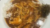 ここはカレー専門店ではないですが、カレーの写真が美味しそうなので行ってみた。 一階が厨房と売店、2階に席がある。席はカウンター4席、テーブル2つ。完全キャッシュレス店です。 カレールーは2種類 昔なつかし幸せの黄色いカレーとひよこ豆のキーマカレーライス 注文あいがけにしてみた。スマホでQR読込注文です 2種類共とろみがかなり強めでうどん屋で出てくるようなとろみの強さですが、そんなにもたれる感じもなく後味そわな悪くないです。たしかになつかしい感じのカレーでした