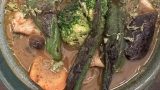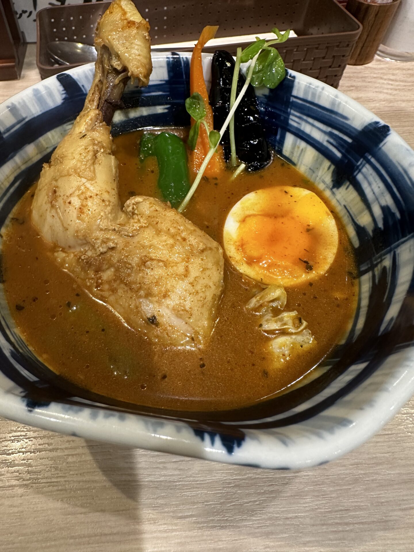 八王子で行って以来の奥芝商店 平日ランチ行列覚悟していたが、すんなり入れた。 チキンが食べたかったのでこの店限定の浪漫号の始発!カレー注文。 うどんの丼みたいなのに入ってきた。 他のメニューに比べて具の量、種類は控えめな分値段も抑えめで1400円。これをベースカレーにしてトッピング追加するのが良いのかも。ルーは1種類のみですが、奥芝商店のスープ好きなので大丈夫