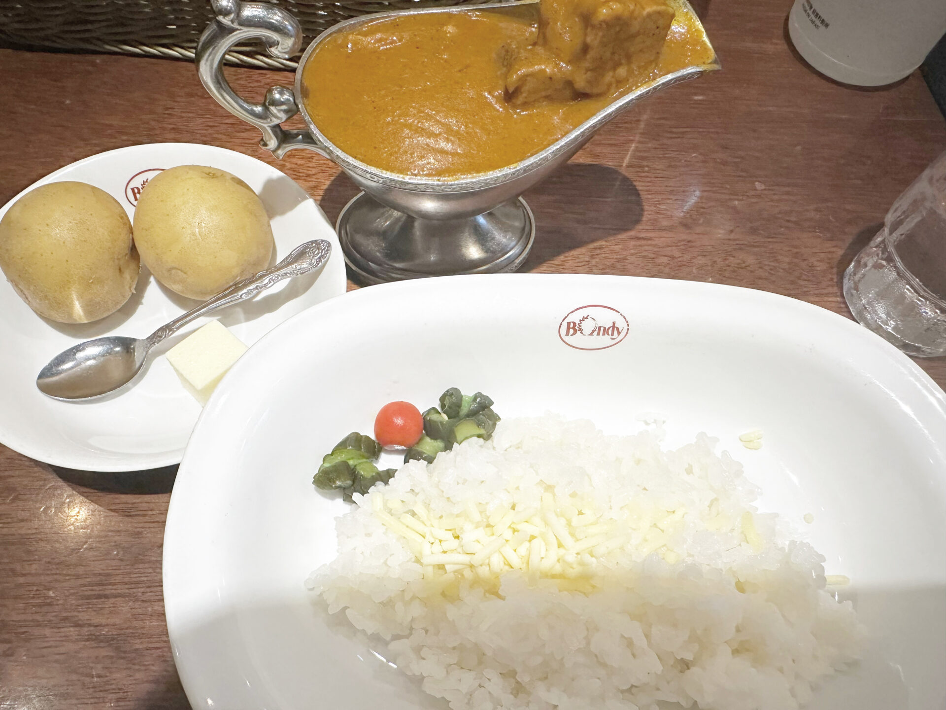 10時半前着でもすごい行列幸い1巡目で入れた。 店内レトロ喫茶店のような雰囲気 1番人気のビーフカレー注文。ボンディは茹でジャガイモついてくるこれが美味しい。そのままバターで食べるのもいいしカレーに混ぜて食べるのもいい 相変わらず肉の量がすごく食べ応えある。ルーは懐かしくもある甘すぎず辛すぎず万人受けしそうな味。