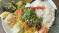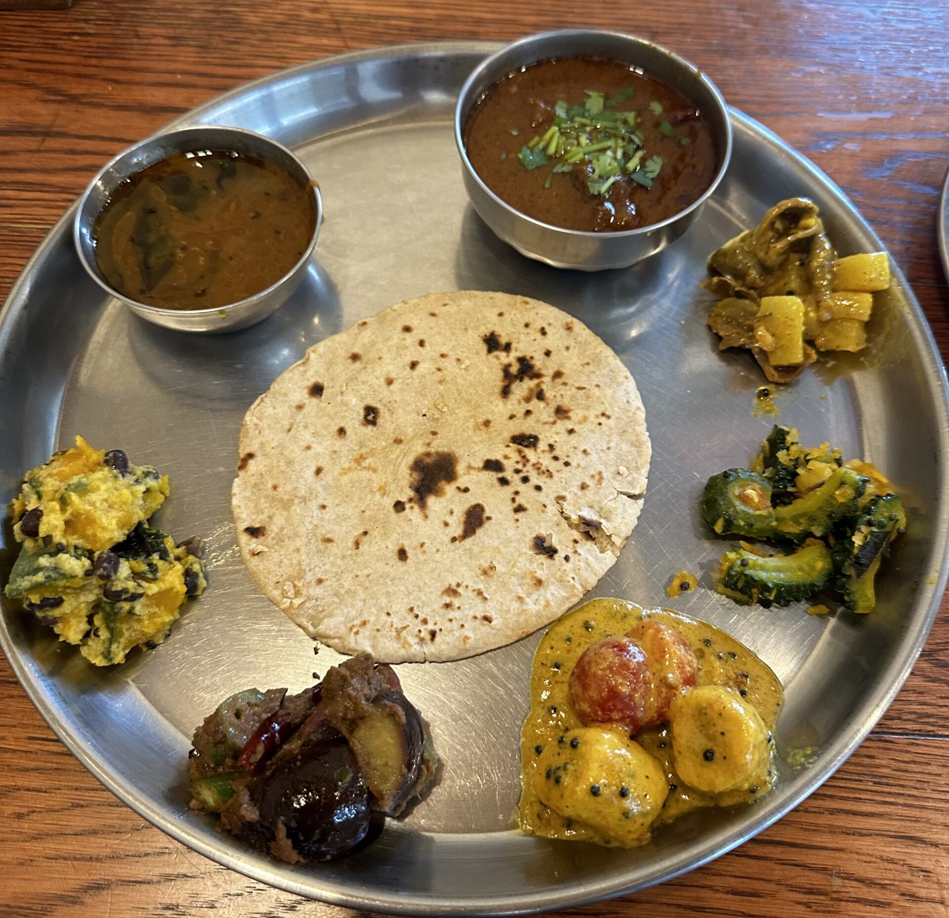 テーブル席3つとカウンターです。目立たないところですが、平日昼客はどんどん入ってきて、満席で帰る人も結構居た。 メニュー的には南インド系ですかね。ランチのミールスは4種類。で2種以上も選べる +150円でチャパティ選べるので、ライスなしでチャパティにしてみた。 辛さ加減が絶妙で、今まで食べた中でかなり上位クラスの南インドカレー。付け合わせもどれも美味しい。バナナのスパイス漬け込んだのもあり、これが特に気に入った。